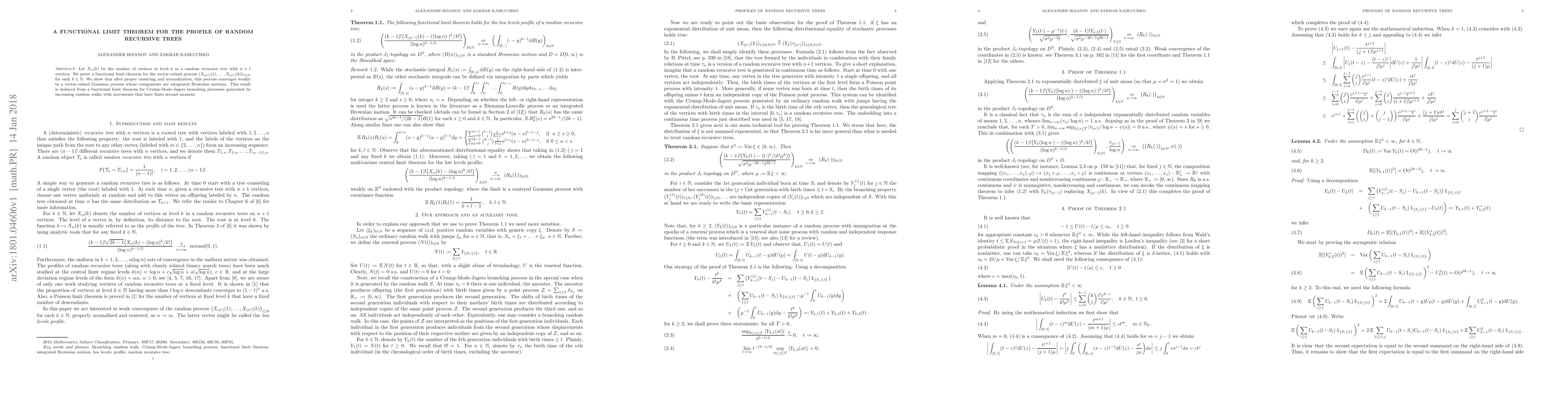 Let $X_n(k)$ be the number of vertices at level $k$ in a random recursive tree with $n+1$ vertices. We prove a functional limit theorem for the vector-valued process $(X_{[n^t]}(1),\ldots, X_{[n^t]}(k))_{t\geq 0}$, for each $k\in\mathbb N$. We show that after proper centering and normalization, this process converges weakly to a vector-valued Gaussian process whose components are integrated Brownian motions. This result is deduced from a functional limit theorem for Crump-Mode-Jagers branching processes generated by increasing random walks with increments that have finite second moment.