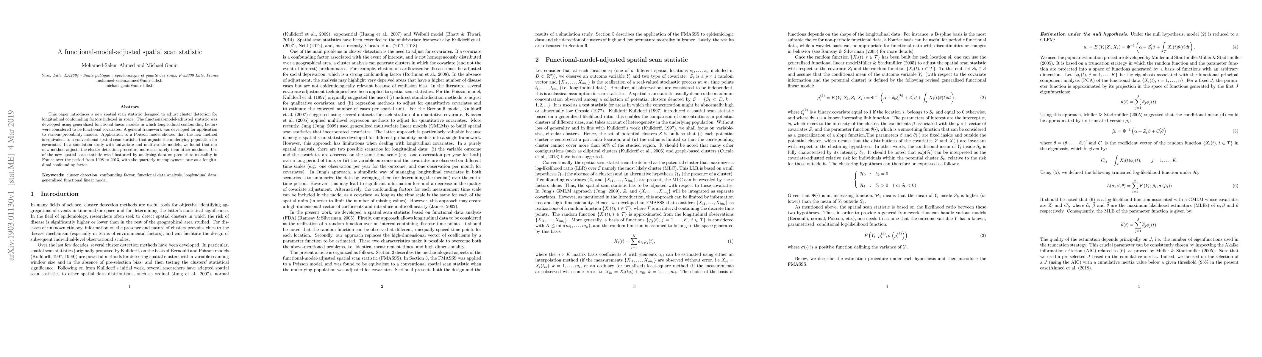 This paper proposes a functional-model-adjusted spatial scan statistic to improve cluster detection by accounting for longitudinal confounding factors, demonstrating its effectiveness through a simulation study and application to premature mortality data in France. The method adjusts cluster detection more accurately than conventional methods.