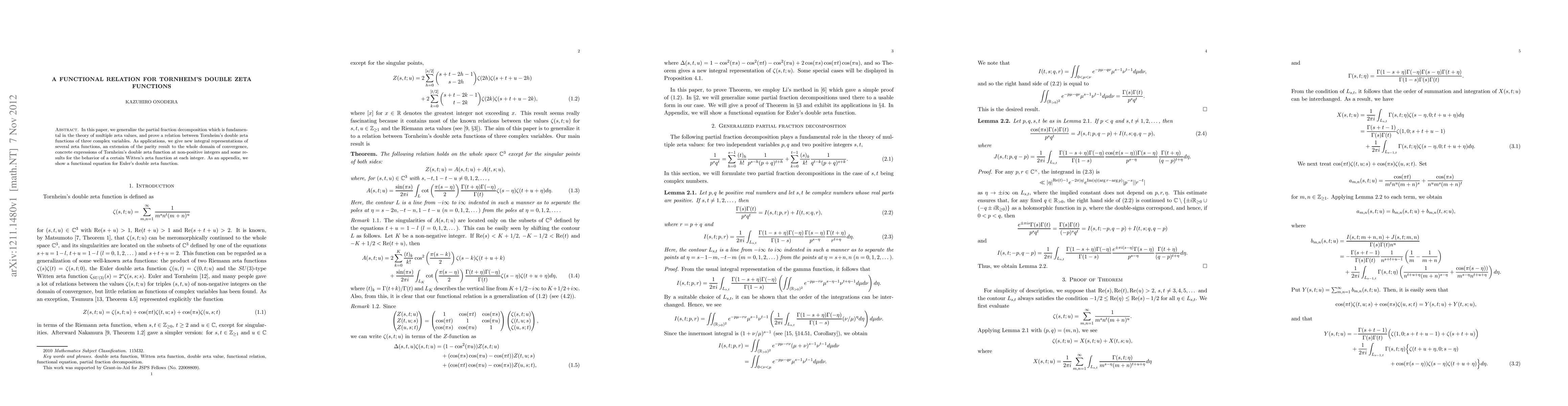 In this paper, we generalize the partial fraction decomposition which is fundamental in the theory of multiple zeta values, and prove a relation between Tornheim's double zeta functions of three complex variables. As applications, we give new integral representations of several zeta functions, an extension of the parity result to the whole domain of convergence, concrete expressions of Tornheim's double zeta function at non-positive integers and some results for the behavior of a certain Witten's zeta function at each integer. As an appendix, we show a functional equation for Euler's double zeta function.