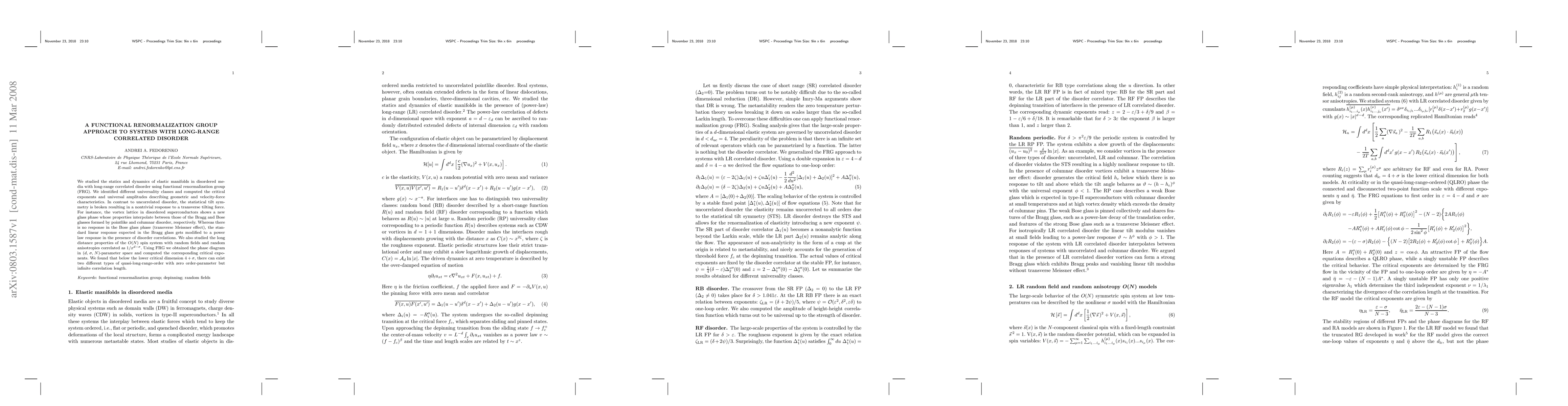 We studied the statics and dynamics of elastic manifolds in disordered media with long-range correlated disorder using functional renormalization group (FRG). We identified different universality classes and computed the critical exponents and universal amplitudes describing geometric and velocity-force characteristics. In contrast to uncorrelated disorder, the statistical tilt symmetry is broken resulting in a nontrivial response to a transverse tilting force. For instance, the vortex lattice in disordered superconductors shows a new glass phase whose properties interpolate between those of the Bragg and Bose glasses formed by pointlike and columnar disorder, respectively. Whereas there is no response in the Bose glass phase (transverse Meissner effect), the standard linear response expected in the Bragg-glass gets modified to a power law response in the presence of disorder correlations. We also studied the long distance properties of the O(N) spin system with random fields and random anisotropies correlated as 1/x^{d-sigma}. Using FRG we obtained the phase diagram in (d,sigma,N)-parameter space and computed the corresponding critical exponents. We found that below the lower critical dimension 4+sigma, there can exist two different types of quasi-long-range-order with zero order-parameter but infinite correlation length.