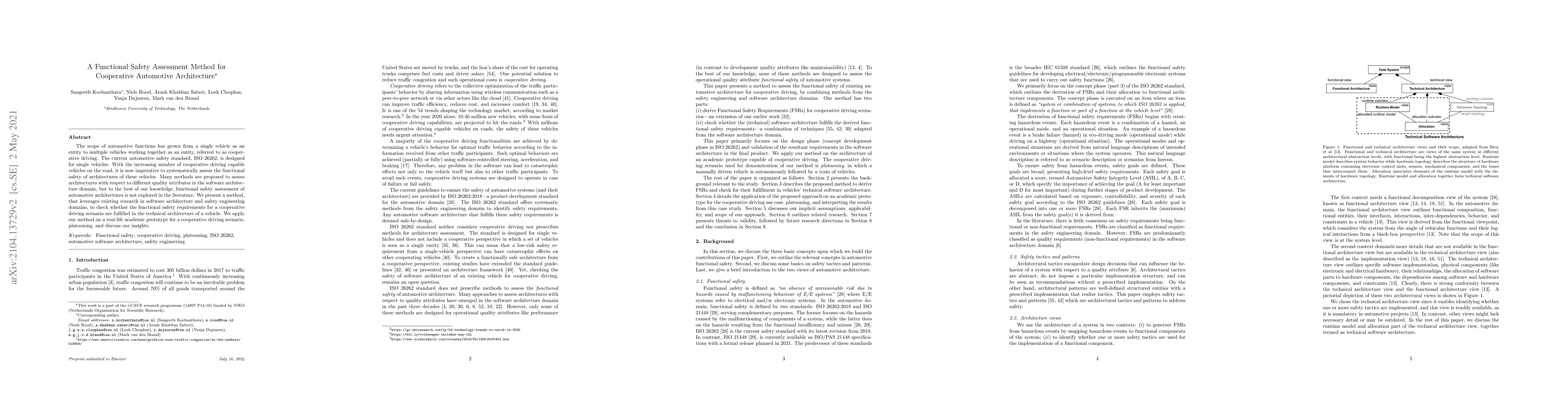 This paper introduces a novel method for assessing the functional safety of cooperative automotive architectures, addressing the limitations of existing standards like ISO 26262, which focus on single vehicles. The proposed method integrates insights from software architecture and safety engineering to evaluate whether safety requirements are met in cooperative driving scenarios, demonstrated through a prototype application in platooning.