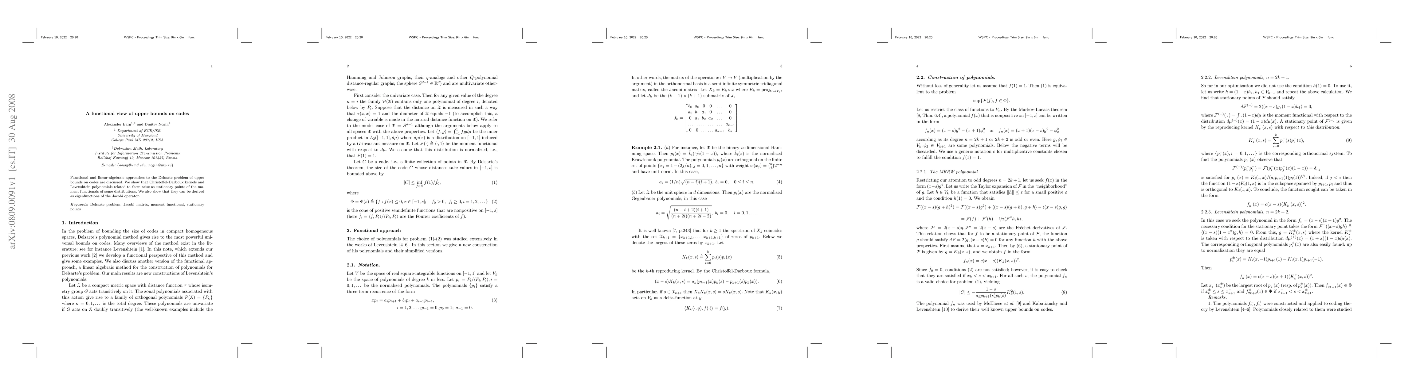 Functional and linear-algebraic approaches to the Delsarte problem of upper bounds on codes are discussed. We show that Christoffel-Darboux kernels and Levenshtein polynomials related to them arise as stationary points of the moment functionals of some distributions. We also show that they can be derived as eigenfunctions of the Jacobi operator. This motivates the choice of polynomials used to derive linear programming upper bounds on codes in homogeneous spaces.