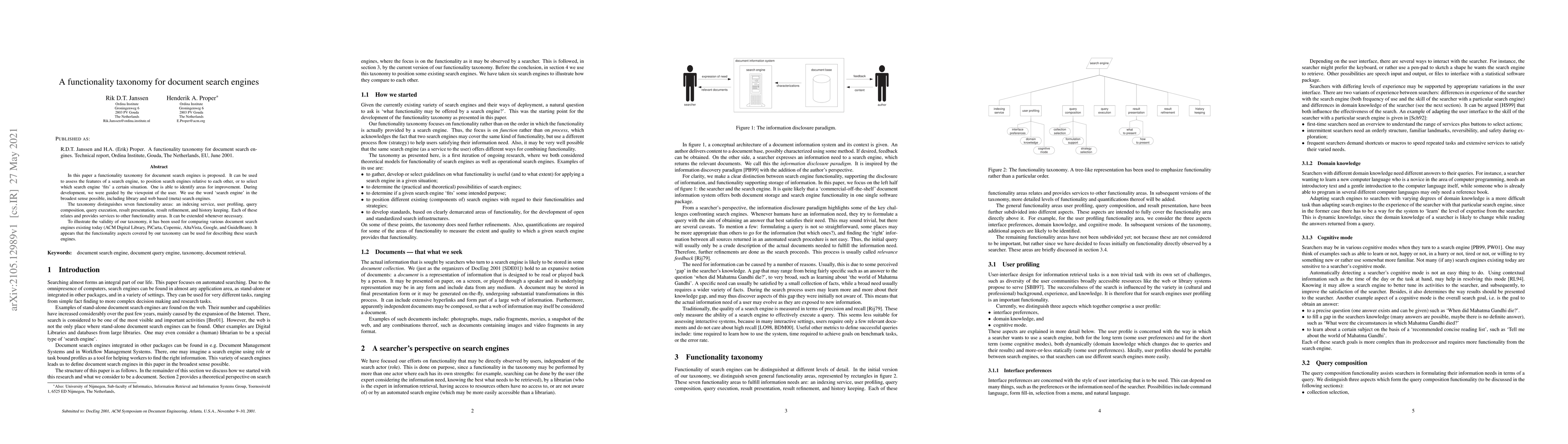 This paper proposes a comprehensive functionality taxonomy for document search engines, including indexing, user profiling, query composition, execution, result presentation, refinement, and history keeping. The taxonomy is used to compare and assess various search engines, demonstrating its utility in identifying strengths and areas for improvement.