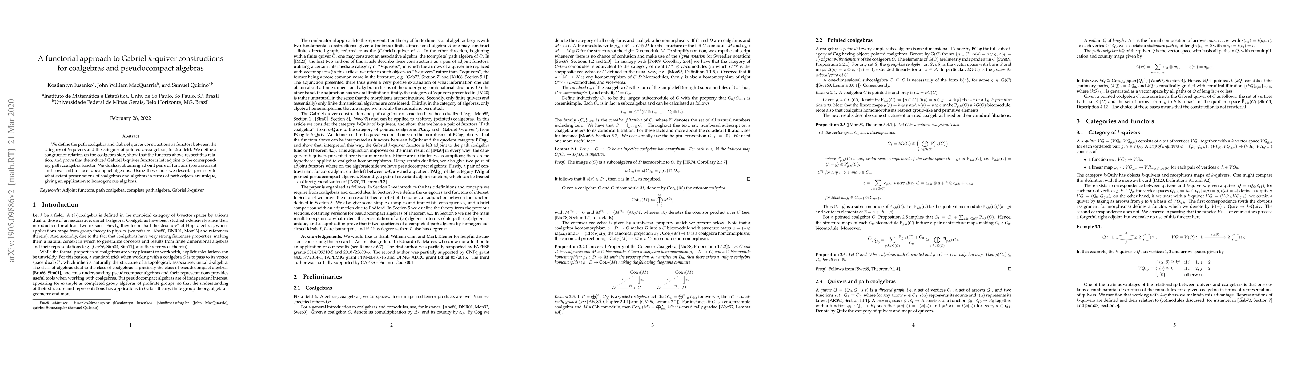 This paper establishes functors between $k$-quivers and pointed $k$-coalgebras, defining a congruence relation on coalgebras and proving that the Gabriel $k$-quiver functor is left adjoint to the path coalgebra functor. It also provides dual results for pseudocompact algebras, detailing the uniqueness of coalgebra and algebra presentations via path objects.