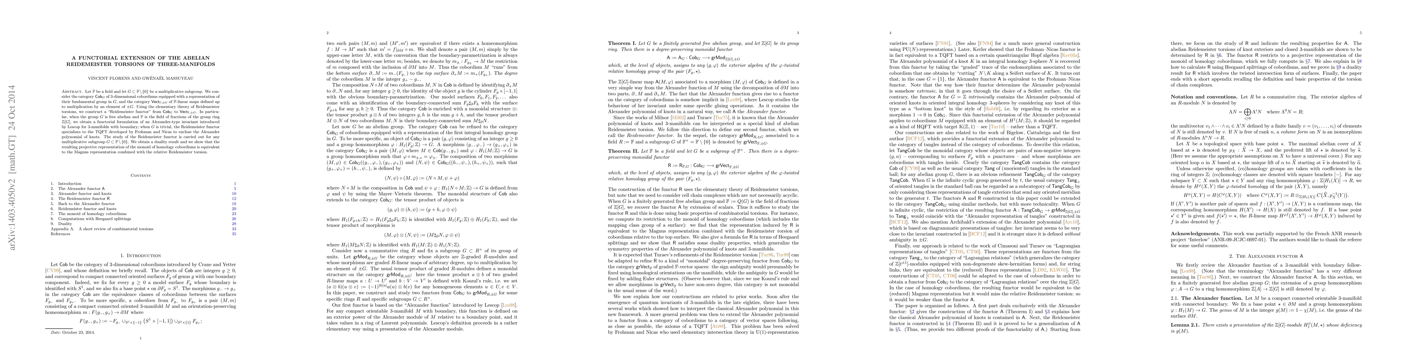 This paper constructs a "Reidemeister functor" that extends the concept of abelian Reidemeister torsions to three-dimensional cobordisms, providing a functorial formulation of Alexander-type invariants for 3-manifolds. The study reveals a duality result and links the resulting projective representation to the Magnus representation and relative Reidemeister torsion.