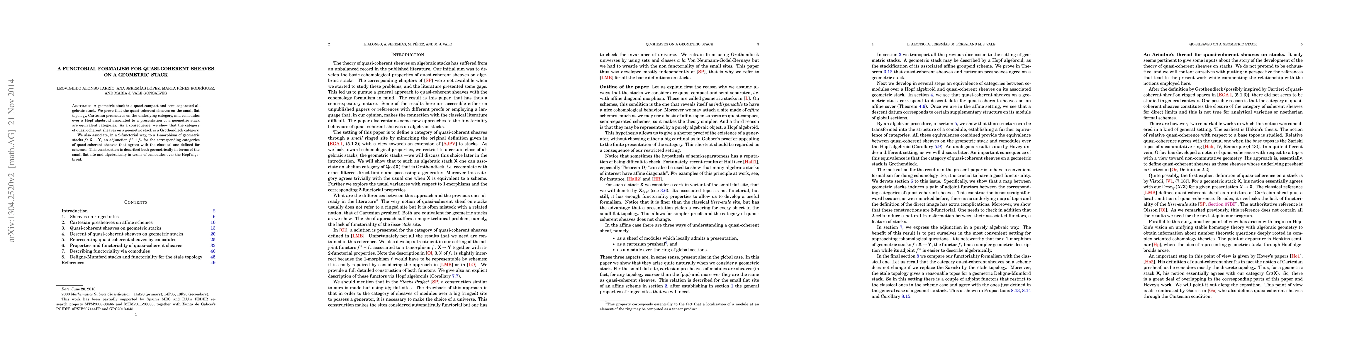 This paper establishes an equivalence between quasi-coherent sheaves on geometric stacks via three perspectives: Cartesian presheaves, comodules over Hopf algebroids, and small flat topology. It concludes that these sheaves form a Grothendieck category and introduces a 2-functorial adjunction for quasi-coherent sheaves between geometric stacks.