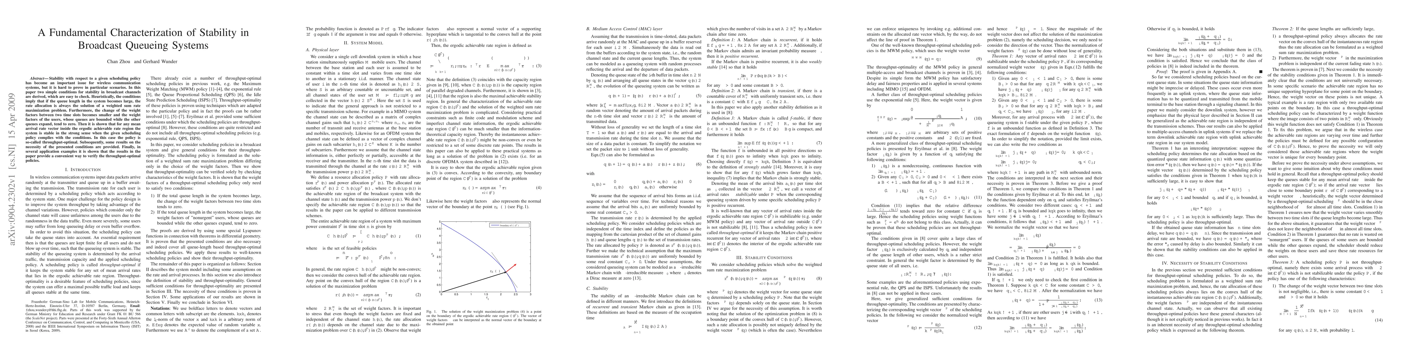 Stability with respect to a given scheduling policy has become an important issue for wireless communication systems, but it is hard to prove in particular scenarios. In this paper two simple conditions for stability in broadcast channels are derived, which are easy to check. Heuristically, the conditions imply that if the queue length in the system becomes large, the rate allocation is always the solution of a weighted sum rate maximization problem. Furthermore, the change of the weight factors between two time slots becomes smaller and the weight factors of the users, whose queues are bounded while the other queues expand, tend to zero. Then it is shown that for any mean arrival rate vector inside the ergodic achievable rate region the system is stable in the strong sense when the given scheduling policy complies with the conditions. In this case the policy is so-called throughput-optimal. Subsequently, some results on the necessity of the presented conditions are provided. Finally, in several application examples it is shown that the results in the paper provide a convenient way to verify the throughput-optimal policies.