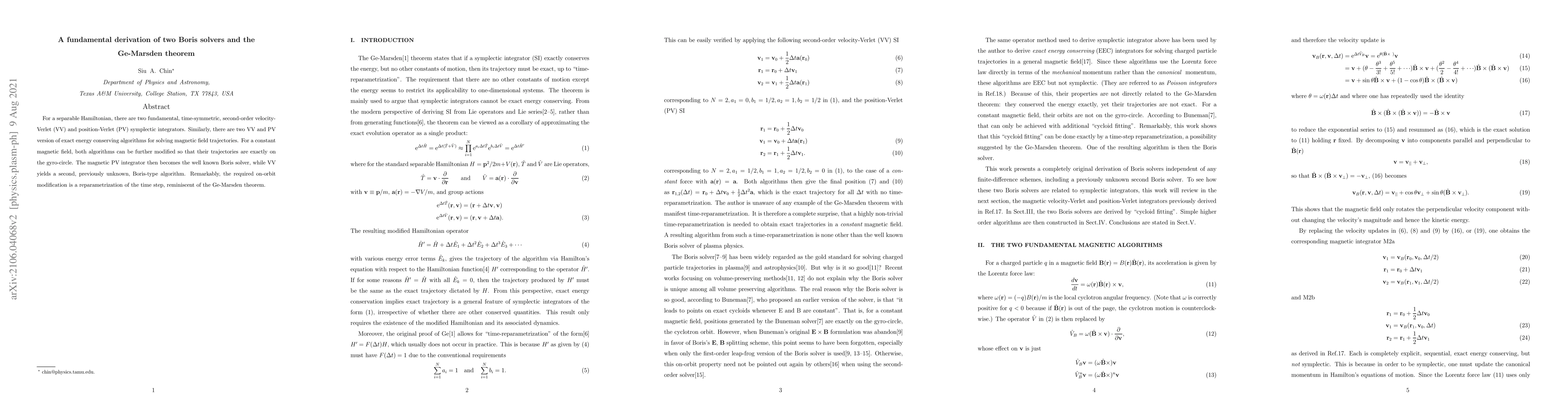This paper derives two Boris solvers for solving magnetic field trajectories, revealing a previously unknown variant alongside the well-known Boris solver. It connects these derivations to the Ge-Marsden theorem through a reparametrization of the time step.