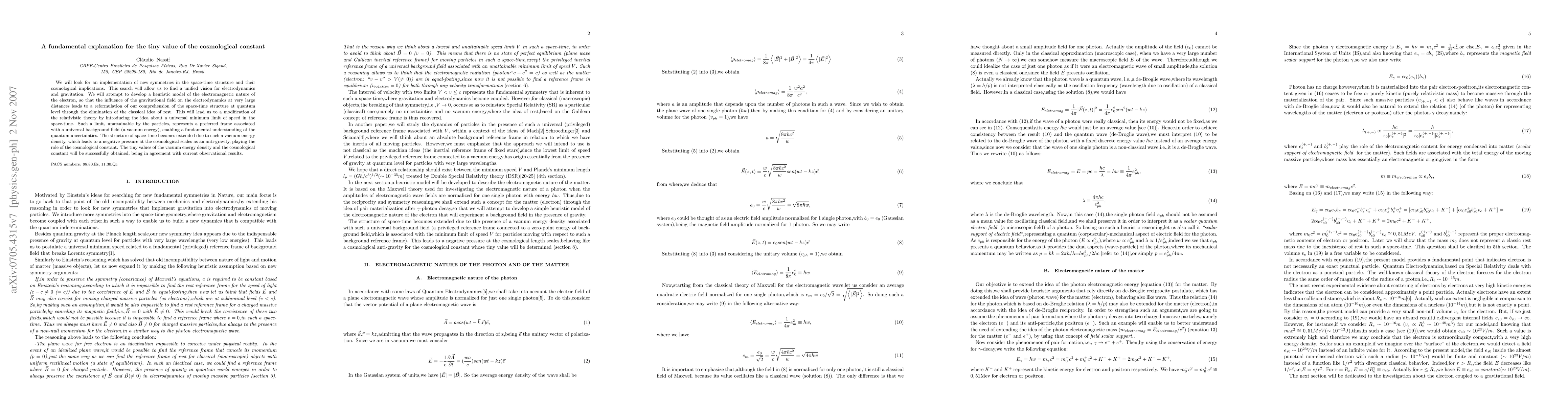 We will look for an implementation of new symmetries in the space-time structure and their cosmological implications. This search will allow us to find a unified vision for electrodynamics and gravitation. We will attempt to develop a heuristic model of the electromagnetic nature of the electron, so that the influence of the gravitational field on the electrodynamics at very large distances leads to a reformulation of our comprehension of the space- time structure at quantum level through the elimination of the classical idea of rest. This will lead us to a modification of the relativistic theory by introducing the idea about a universal minimum limit of speed in the space- time. Such a limit, unattainable by the particles, represents a preferred frame associated with a universal background field (a vacuum energy), enabling a fundamental understanding of the quantum uncertainties. The structure of space-time becomes extended due to such a vacuum energy density, which leads to a negative pressure at the cosmological scales as an anti-gravity, playing the role of the cosmological constant. The tiny values of the vacuum energy density and the cosmological constant will be successfully obtained, being in agreement with current observational results.