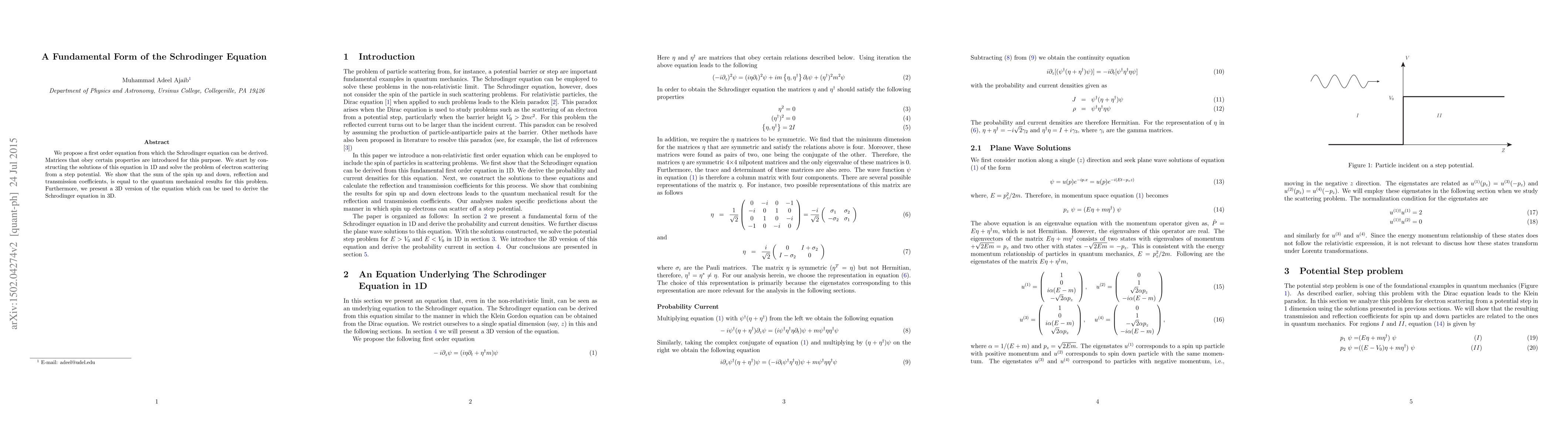 We propose a first order equation from which the Schrodinger equation can be derived. Matrices that obey certain properties are introduced for this purpose. We start by constructing the solutions of this equation in 1D and solve the problem of electron scattering from a step potential. We show that the sum of the spin up and down, reflection and transmission coefficients, is equal to the quantum mechanical results for this problem. Furthermore, we present a 3D version of the equation which can be used to derive the Schrodinger equation in 3D.