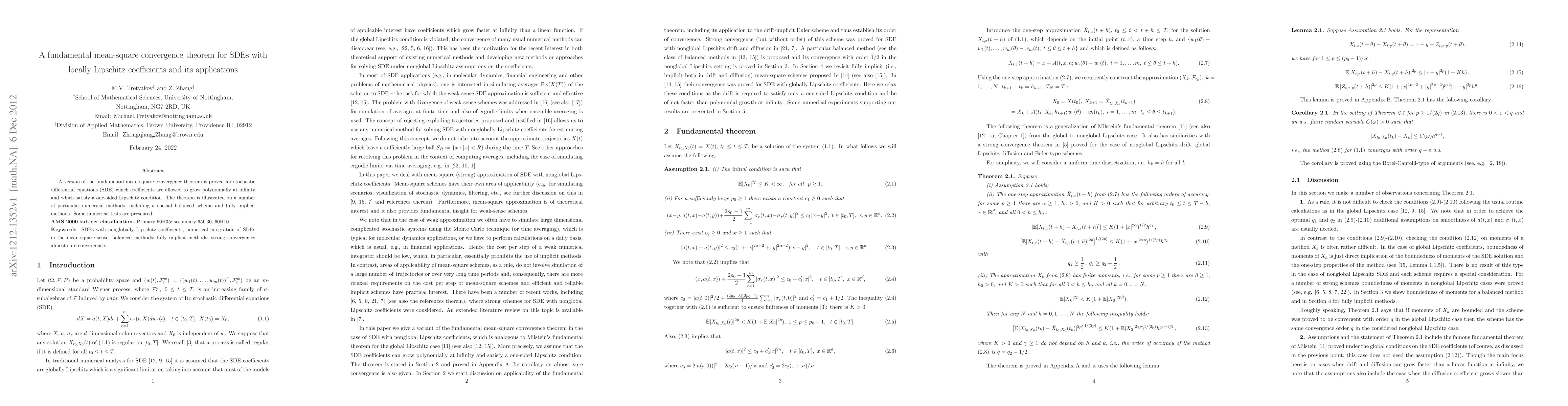 A novel mean-square convergence theorem is proven for stochastic differential equations with locally Lipschitz coefficients, allowing for polynomial coefficient growth at infinity. The theorem has applications in numerical methods, including special balanced schemes and fully implicit methods.