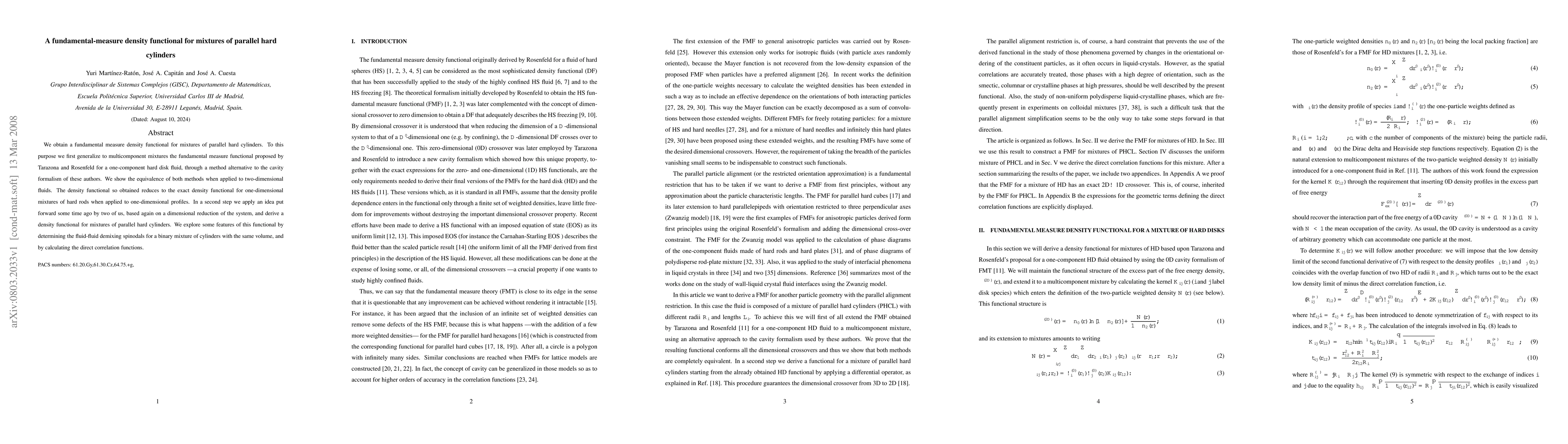 This paper develops a fundamental measure density functional for mixtures of parallel hard cylinders, generalizing the Tarazona and Rosenfeld functional for hard disks to multicomponent systems. The derived functional is validated through dimensional reduction and applied to determine fluid-fluid demixing spinodals and direct correlation functions for binary mixtures.