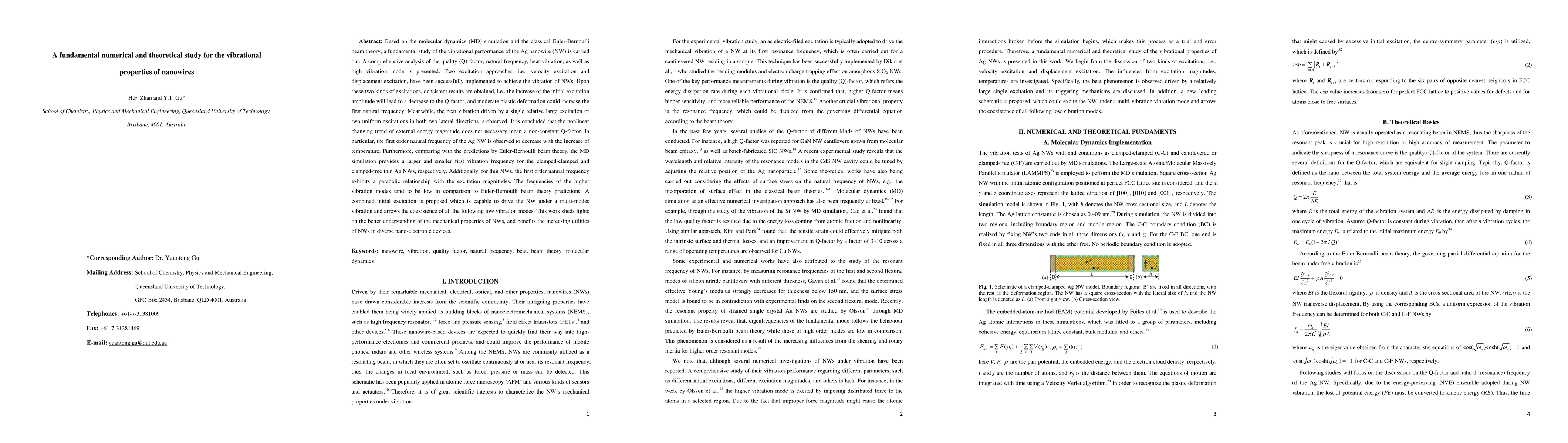 Based on the molecular dynamics (MD) simulation and the classical Euler-Bernoulli beam theory, a fundamental study of the vibrational performance of the Ag nanowire (NW) is carried out. A comprehensive analysis of the quality (Q)-factor, natural frequency, beat vibration, as well as high vibration mode is presented. Two excitation approaches, i.e., velocity excitation and displacement excitation, have been successfully implemented to achieve the vibration of NWs. Upon these two kinds of excitations, consistent results are obtained, i.e., the increase of the initial excitation amplitude will lead to a decrease to the Q-factor, and moderate plastic deformation could increase the first natural frequency. Meanwhile, the beat vibration driven by a single relative large excitation or two uniform excitations in both two lateral directions is observed. It is concluded that the nonlinear changing trend of external energy magnitude does not necessary mean a non-constant Q-factor. In particular, the first order natural frequency of the Ag NW is observed to decrease with the increase of temperature. Furthermore, comparing with the predictions by Euler-Bernoulli beam theory, the MD simulation provides a larger and smaller first vibration frequency for the clamped-clamped and clamped-free thin Ag NWs, respectively. Additionally, for thin NWs, the first order natural frequency exhibits a parabolic relationship with the excitation magnitudes. The frequencies of the higher vibration modes tend to be low in comparison to Euler-Bernoulli beam theory predictions. A combined initial excitation is proposed which is capable to drive the NW under a multi-modes vibration and arrows the coexistence of all the following low vibration modes. This work sheds lights on the better understanding of the mechanical properties of NWs, and benefits the increasing utilities of NWs in diverse nano-electronic devices.