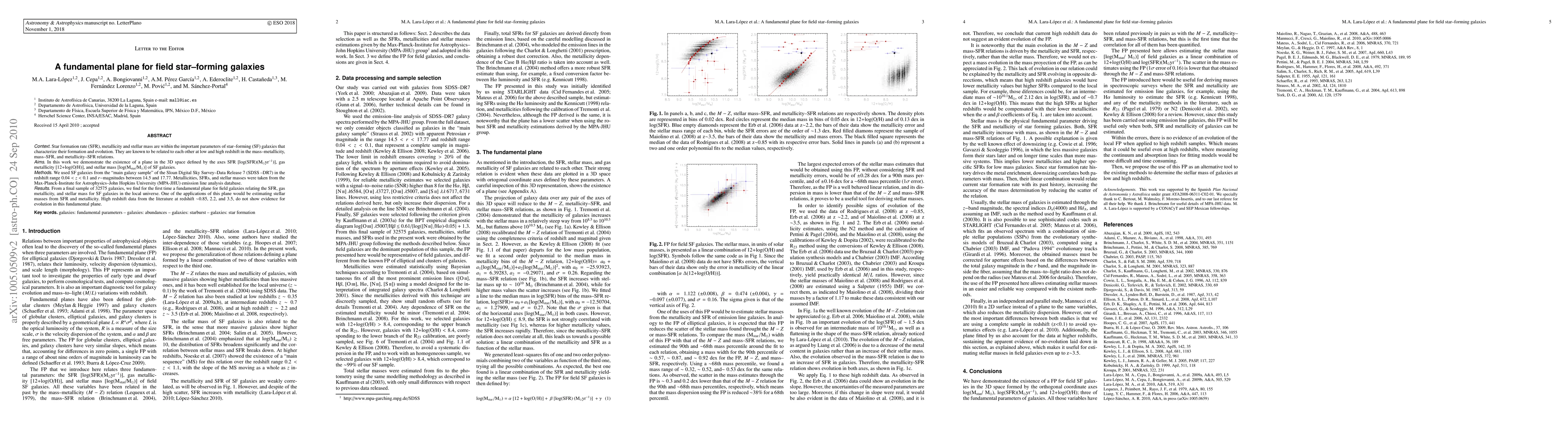 Star formation rate (SFR), metallicity and stellar mass are within the important parameters of star--forming galaxies that characterize their formation and evolution. They are known to be related to each other at low and high redshift in the mass--metallicity, mass--SFR, and metallicity--SFR relations. In this work we demonstrate the existence of a plane in the 3D space defined by the axes SFR [log(SFR)(M_sun yr^-1)], gas metallicity [12+log(O/H)], and stellar mass [log(M_star/M_sun)] of star-forming galaxies. We used star--forming galaxies from the "main galaxy sample" of the Sloan Digital Sky Survey--Data Release 7 (SDSS-DR7) in the redshift range 0.04 < z < 0.1 and r-magnitudes between 14.5 and 17.77. Metallicities, SFRs, and stellar masses were taken from the Max-Planck-Institute for Astrophysics-John Hopkins University (MPA-JHU) emission line analysis database. From a final sample of 44214 galaxies, we find for the first time a fundamental plane for field galaxies relating the SFR, gas metallicity, and stellar mass for star--forming galaxies in the local universe. One of the applications of this plane would be estimating stellar masses from SFR and metallicity. High redshift data from the literature at redshift ~2.2 and 3.5, do not show evidence for evolution in this fundamental plane.