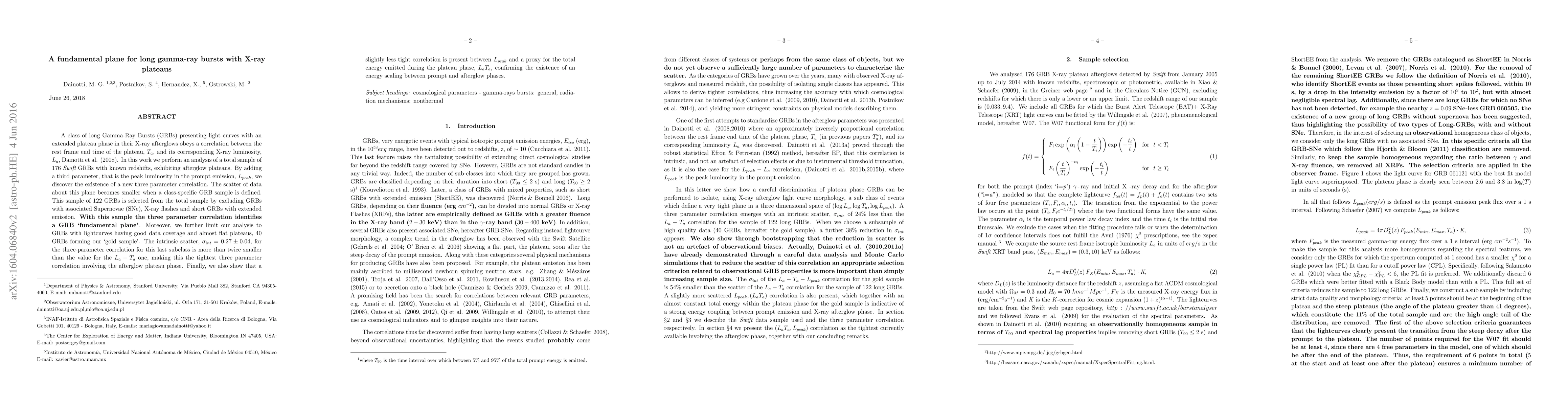 This research identifies a "fundamental plane" for long gamma-ray bursts (GRBs) with X-ray plateaus, revealing a three-parameter correlation between the plateau end time, X-ray luminosity, and peak luminosity of the prompt emission. The intrinsic scatter for this correlation is significantly reduced in a refined sample, indicating a tighter relationship.