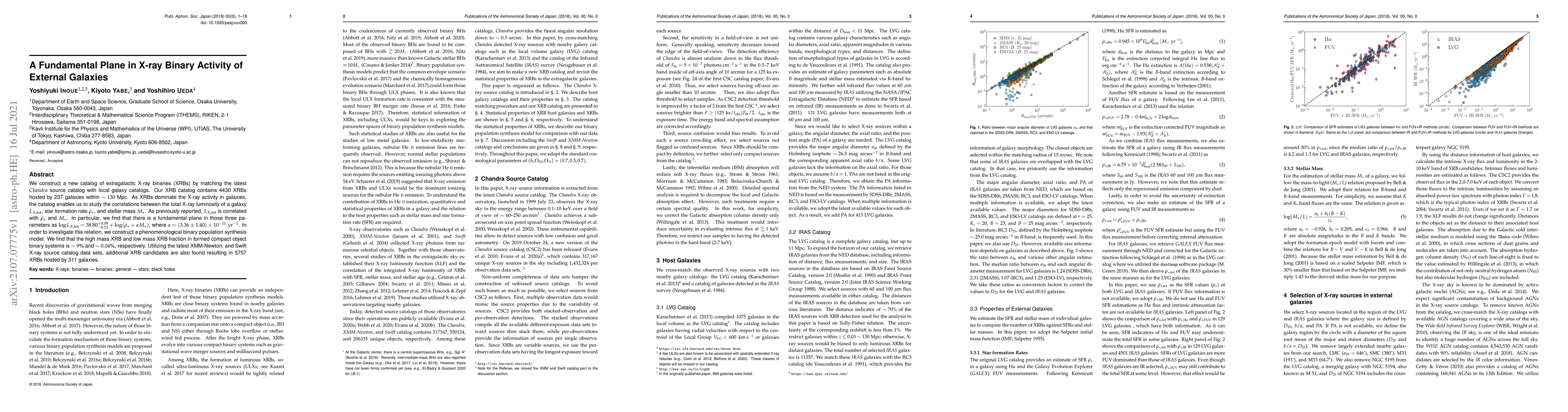 We construct a new catalog of extragalactic X-ray binaries (XRBs) by matching the latest Chandra source catalog with local galaxy catalogs. Our XRB catalog contains 4430 XRBs hosted by 237 galaxies within ~130 Mpc. As XRBs dominate the X-ray activity in galaxies, the catalog enables us to study the correlations between the total X-ray luminosity of a galaxy $L_{X,\rm tot}$, star formation rate $\dot{\rho}_\star$, and stellar mass $M_\star$. As previously reported, $L_{X,\rm tot}$ is correlated with $\dot{\rho}_\star$ and $M_\star$. In particular, we find that there is a fundamental plane in those three parameters as $\log L_{X,\rm tot}={38.80^{+0.09}_{-0.12}}+\log(\dot{\rho}_\star + \alpha M_\star)$, where $\alpha = {(3.36\pm1.40)\times10^{-11}}\ {\rm yr^{-1}}$. In order to investigate this relation, we construct a phenomenological binary population synthesis model. We find that the high mass XRB and low mass XRB fraction in formed compact object binary systems is ~9% and ~0.04%, respectively. Utilizing the latest XMM-Newton, and Swift X-ray source catalog data sets, additional XRB candidates are also found resulting in 5757 XRBs hosted by 311 galaxies.
