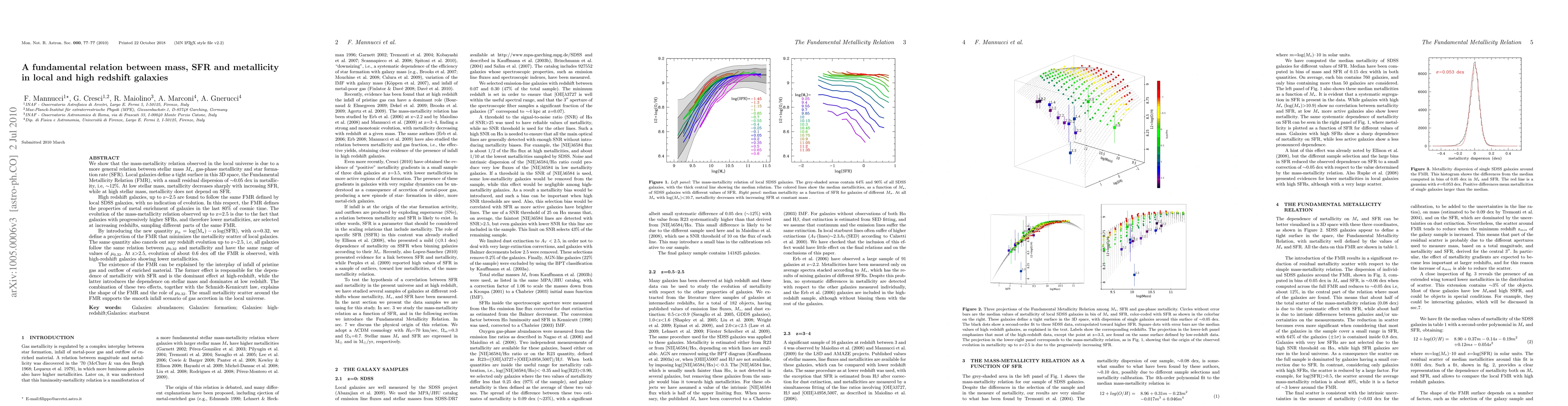 This paper establishes a Fundamental Metallicity Relation (FMR) linking stellar mass, gas-phase metallicity, and star formation rate (SFR) across local and high-redshift galaxies. The FMR explains the observed mass-metallicity relation and shows no significant evolution up to z~2.5, with galaxies at higher redshifts exhibiting lower metallicities.