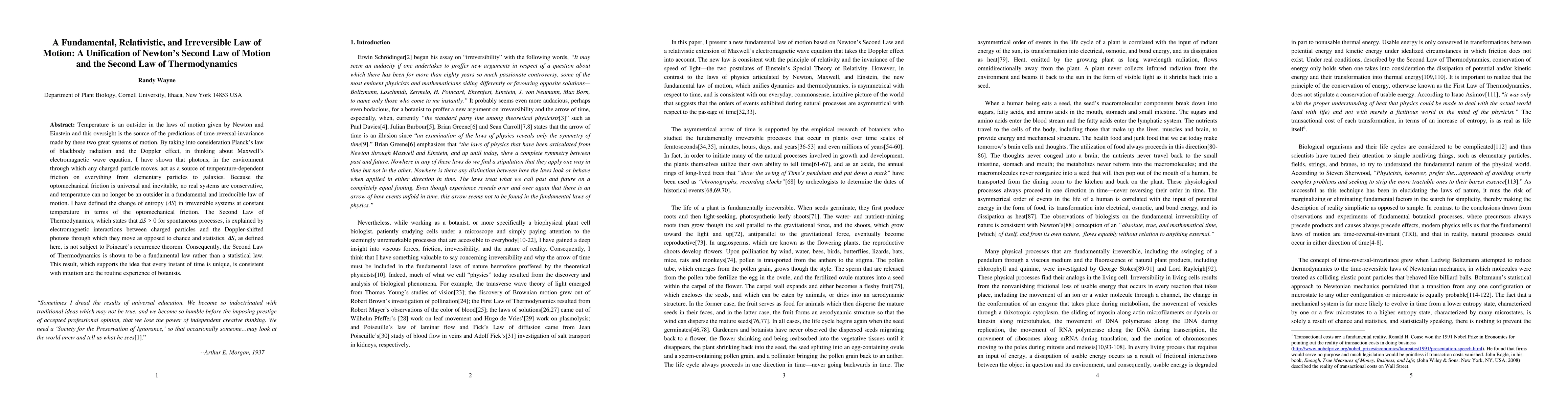 Temperature is an outsider in the laws of motion given by Newton and Einstein and this oversight is the source of the predictions of time-reversal-invariance made by these two great systems of motion. By taking into consideration Planck's law of blackbody radiation and the Doppler effect, in thinking about Maxwell's electromagnetic wave equation, I have shown that photons, in the environment through which any charged particle moves, act as a source of temperature-dependent friction on everything from elementary particles to galaxies. Because the optomechanical friction is universal and inevitable, no real systems are conservative, and temperature can no longer be an outsider in a fundamental and irreducible law of motion. I have defined the change of entropy (\Delta S) in irreversible systems at constant temperature in terms of the optomechanical friction. The Second Law of Thermodynamics, which states that \Delta S > 0 for spontaneous processes, is explained by electromagnetic interactions between charged particles and the Doppler-shifted photons through which they move as opposed to chance and statistics. \Delta S, as defined here, is not subject to Poincar\'e's recurrence theorem. Consequently, the Second Law of Thermodynamics is shown to be a fundamental law rather than a statistical law. This result, which supports the idea that every instant of time is unique, is consistent with intuition and the routine experience of botanists.