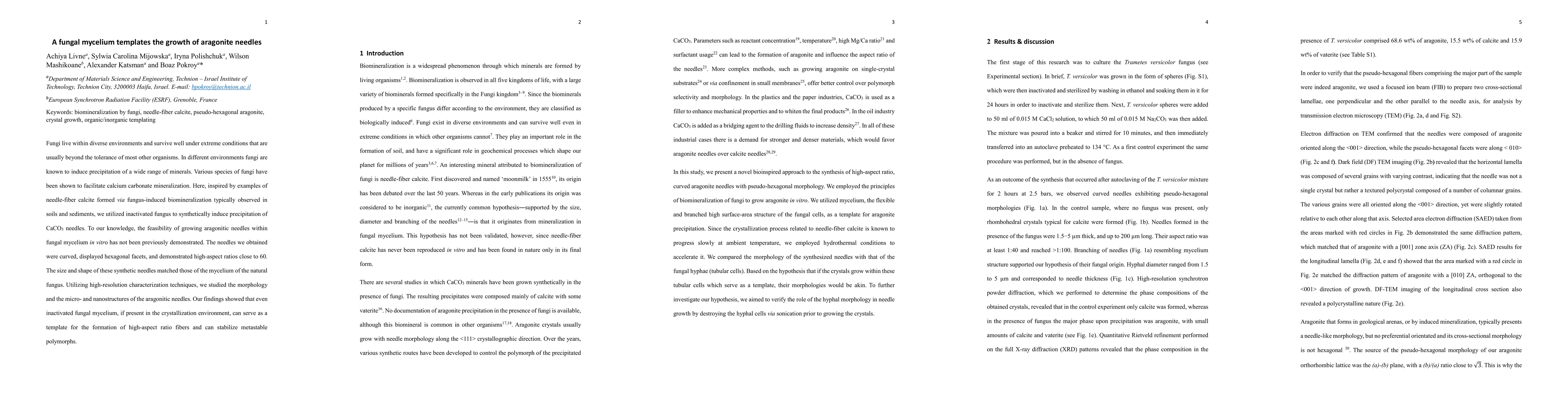 Fungi live within diverse environments and survive well under extreme conditions that are usually beyond the tolerance of most other organisms. In different environments fungi are known to induce precipitation of a wide range of minerals. Various species of fungi have been shown to facilitate calcium carbonate mineralization. Here, inspired by examples of needle-fiber calcite formed via fungus-induced biomineralization typically observed in soils and sediments, we utilized inactivated fungus to synthetically induce precipitation of CaCO3 needles. To our knowledge, the feasibility of growing aragonitic needles within fungal mycelium in vitro has not been previously demonstrated. The needles we obtained were curved, displayed hexagonal facets, and demonstrated high-aspect ratios close to 60. The size and shape of these synthetic needles matched those of the mycelium of the natural fungus. Utilizing high-resolution characterization techniques, we studied the morphology and the micro- and nanostructures of the aragonitic needles. Our findings showed that even inactivated fungal mycelium, if present in the crystallization environment, can serve as a template for the formation of high-aspect ratio fibers and can stabilize metastable polymorphs.