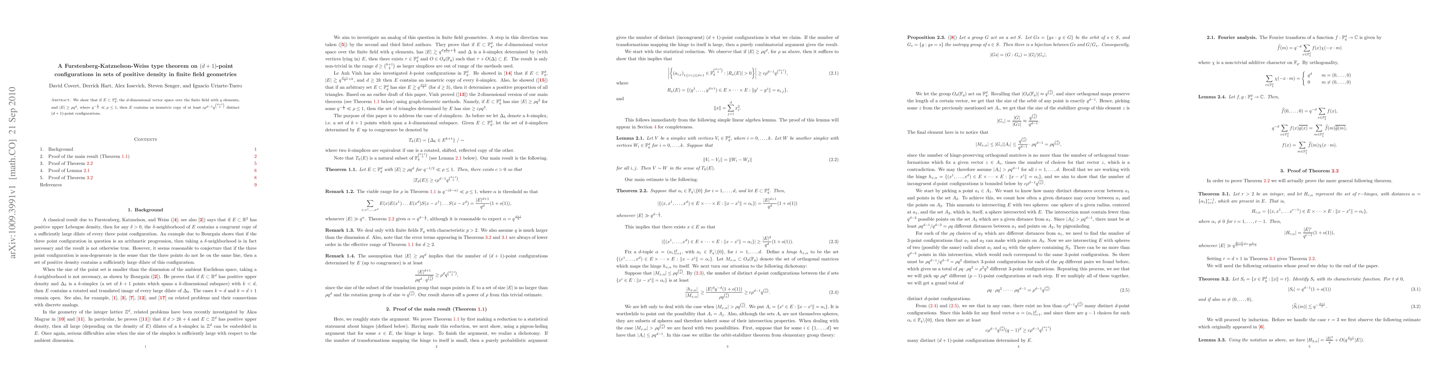 A theorem is proven for finite field geometries, stating that a set of points with positive density contains at least a certain number of distinct (d+1)-point configurations.