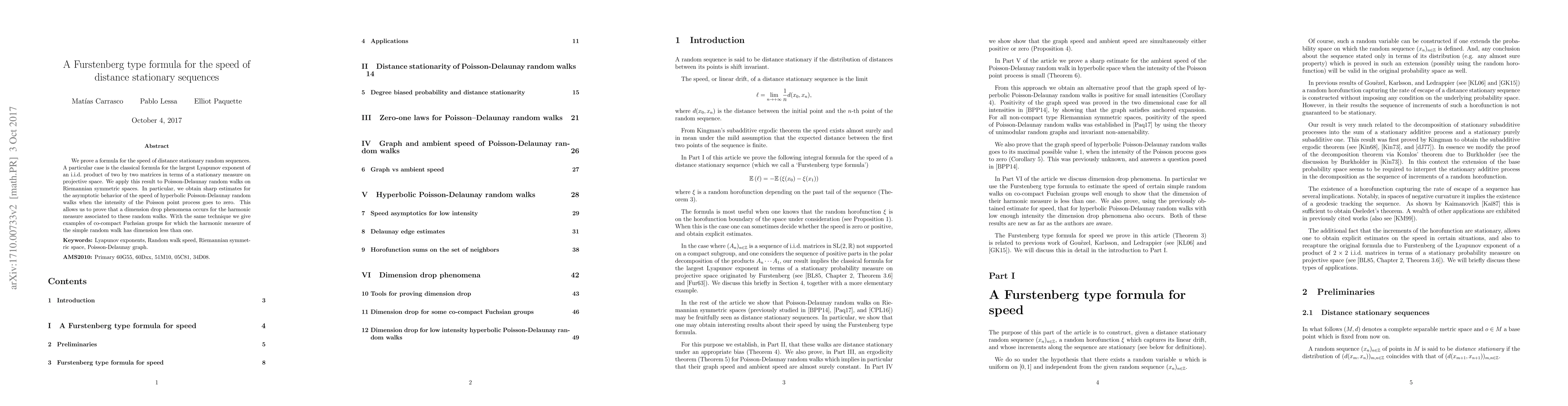 We prove a formula for the speed of distance stationary random sequences. A particular case is the classical formula for the largest Lyapunov exponent of an i.i.d. product of two by two matrices in terms of a stationary measure on projective space. We apply this result to Poisson-Delaunay random walks on Riemannian symmetric spaces. In particular, we obtain sharp estimates for the asymptotic behavior of the speed of hyperbolic Poisson-Delaunay random walks when the intensity of the Poisson point process goes to zero. This allows us to prove that a dimension drop phenomena occurs for the harmonic measure associated to these random walks. With the same technique we give examples of co-compact Fuchsian groups for which the harmonic measure of the simple random walk has dimension less than one.