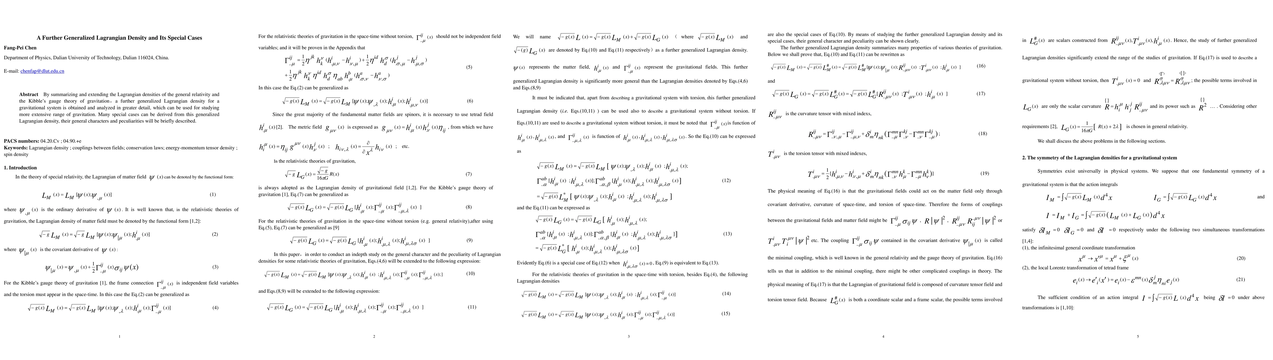 This paper presents a generalized Lagrangian density that extends the frameworks of general relativity and Kibble's gauge theory of gravitation. It analyzes this new density in detail and explores its applications in a broader gravitational context, while also describing various special cases derived from it.