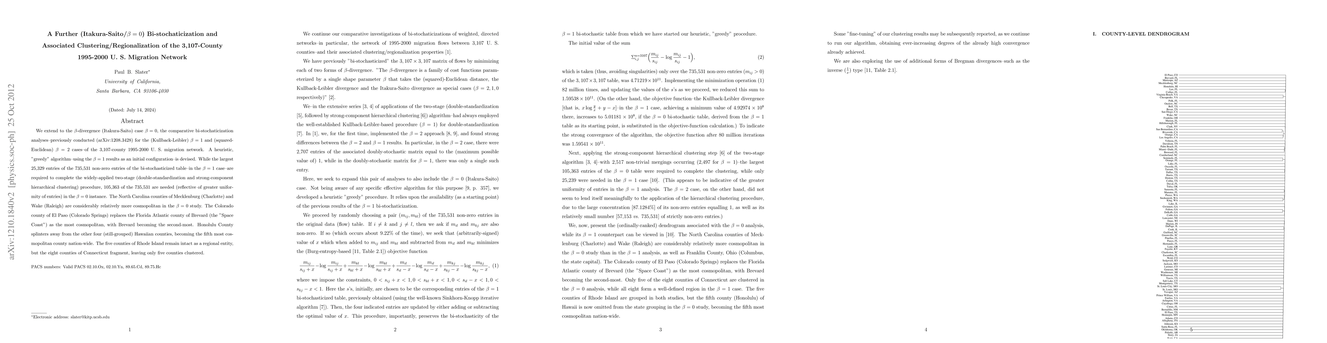We extend to the beta-divergence (Itakura-Saito) case beta =0, the comparative bi-stochaticization analyses-previously conducted (arXiv:1208.3428) for the (Kullback-Leibler) beta=1 and (squared-Euclidean) beta = 2 cases -of the 3,107 - county 1995-2000 U. S. migration network. A heuristic, "greedy" algorithm is devised. While the largest 25,329 entries of the 735,531 non-zero entries of the bi-stochasticized table - in the beta=1 case - are required to complete the widely-applied two-stage (double-standardization and strong-component hierarchical clustering) procedure, 105,363 of the 735,531 are needed (reflective of greater uniformity of entries) in the beta=0 instance. The North Carolina counties of Mecklenburg (Charlotte) and Wake (Raleigh) are considerably relatively more cosmopolitan in the beta=0 study. The Colorado county of El Paso (Colorado Springs) replaces the Florida Atlantic county of Brevard (the "Space Coast") as the most cosmopolitan, with Brevard becoming the second-most. Honolulu County splinters away from the other four (still-grouped) Hawaiian counties, becoming the fifth most cosmopolitan county nation-wide. The five counties of Rhode Island remain intact as a regional entity, but the eight counties of Connecticut fragment, leaving only five counties clustered.