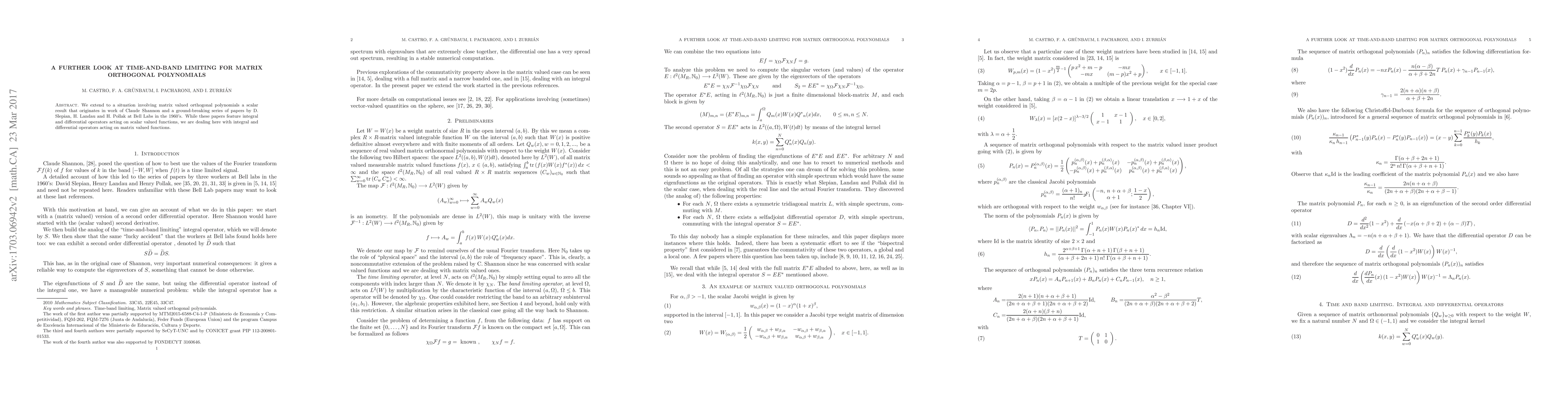 This paper extends Shannon's time-and-band limiting results to matrix orthogonal polynomials, applying integral and differential operators on matrix-valued functions rather than scalars, building on foundational work from Bell Labs in the 1960s.