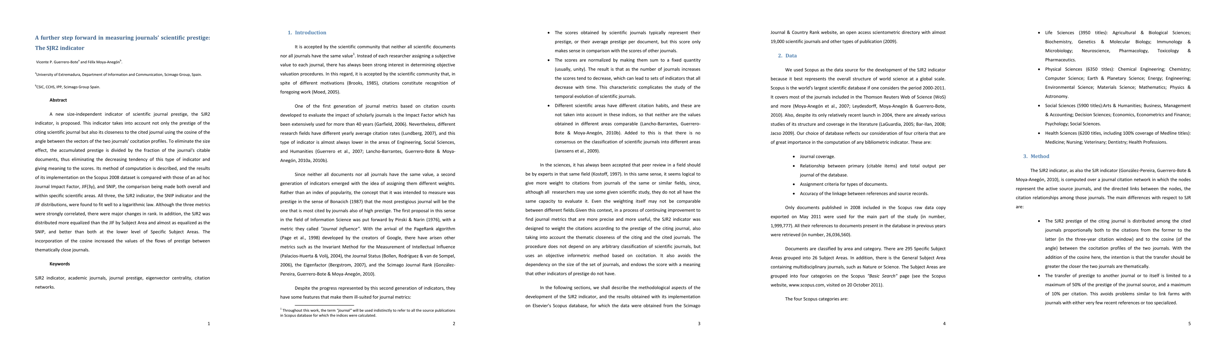 The SJR2 indicator is a new size-independent metric for assessing scientific journal prestige, incorporating the cosine of the angle between journals' cocitation profiles to reflect thematic closeness. Compared to JIF and SNIP, SJR2 showed more equalized rankings across subject areas and better performance at lower-level specific subject areas.