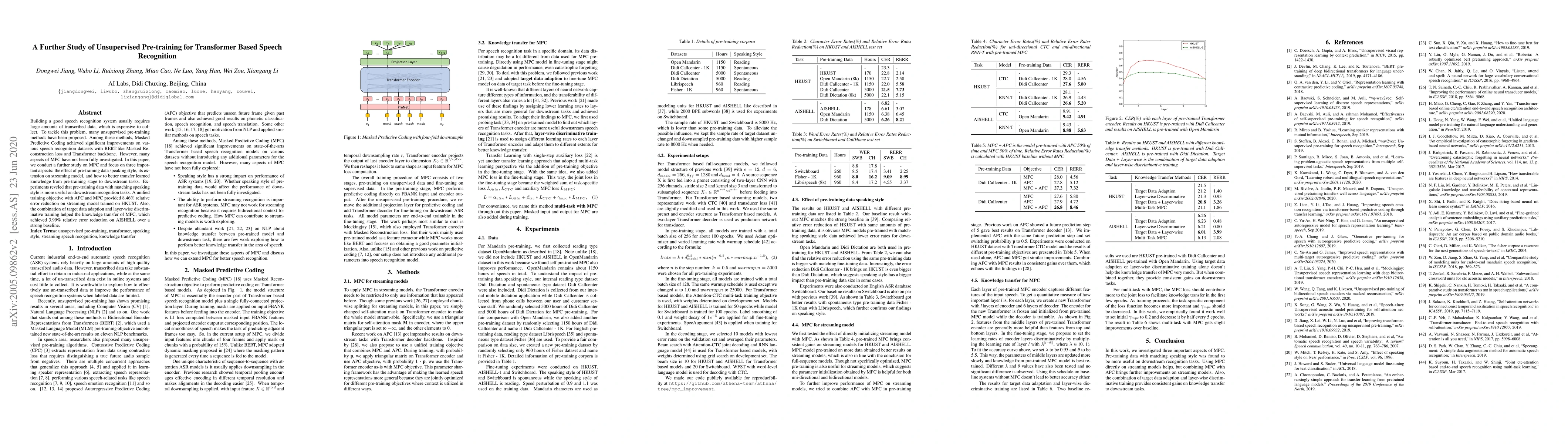 This paper investigates Masked Predictive Coding (MPC) for unsupervised pre-training in Transformer-based speech recognition, focusing on the impact of pre-training data speaking style, streaming model extension, and knowledge transfer techniques. Results show improved performance with matching speaking style and enhanced error reduction through unified training objectives and discriminative training.