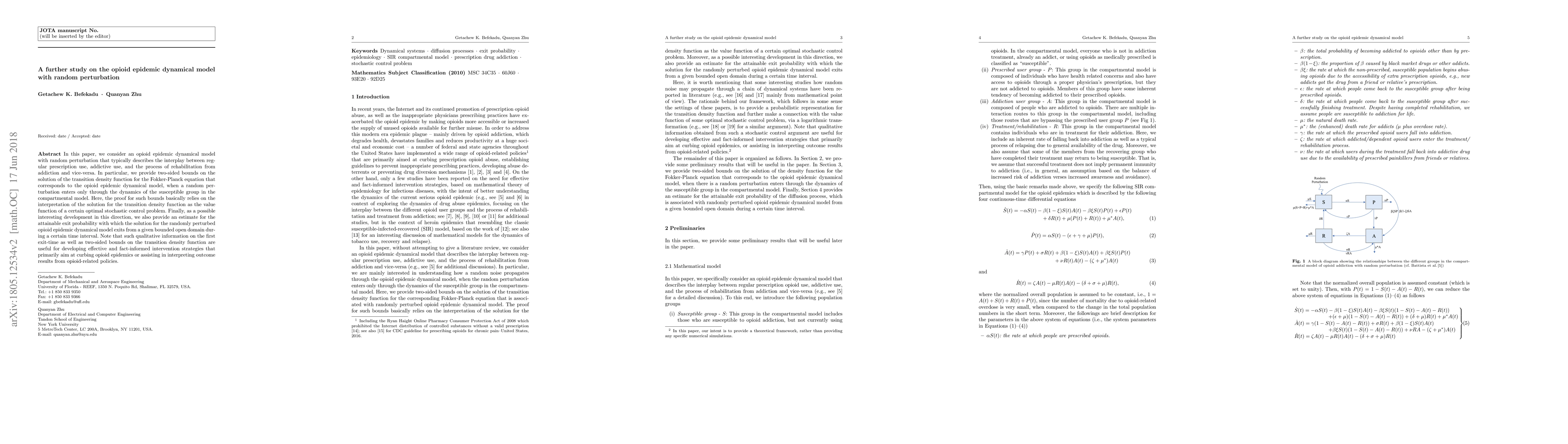 In this paper, we consider an opioid epidemic dynamical model with random perturbation that typically describes the interplay between regular prescription use, addictive use, and the process of rehabilitation from addiction and vice-versa. In particular, we provide two-sided bounds on the solution of the transition density function for the Fokker-Planck equation that corresponds to the opioid epidemic dynamical model, when a random perturbation enters only through the dynamics of the susceptible group in the compartmental model. Here, the proof for such bounds basically relies on the interpretation of the solution for the transition density function as the value function of a certain optimal stochastic control problem. Finally, as a possible interesting development in this direction, we also provide an estimate for the attainable exit probability with which the solution for the randomly perturbed opioid epidemic dynamical model exits from a given bounded open domain during a certain time interval. Note that such qualitative information on the first exit-time as well as two-sided bounds on the transition density function are useful for developing effective and fact-informed intervention strategies that primarily aim at curbing opioid epidemics or assisting in interpreting outcome results from opioid-related policies.
