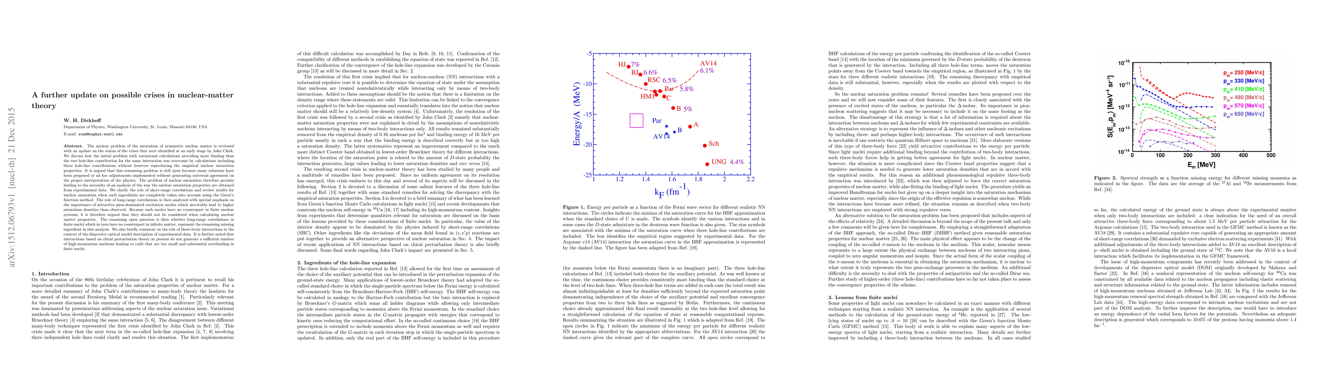 The ancient problem of the saturation of symmetric nuclear matter is reviewed with an update on the status of the crises that were identified at an early stage by John Clark. We discuss how the initial problem with variational calculations providing more binding than the two hole-line contribution for the same interaction was overcome by calculations including three hole-line contributions without however reproducing the empirical nuclear saturation properties. It is argued that this remaining problem is still open because many solutions have been proposed or ad hoc adjustments implemented without generating universal agreement on the proper interpretation of the physics. The problem of nuclear saturation therefore persists leading to the necessity of an analysis of the way the nuclear saturation properties are obtained from experimental data. We clarify the role of short-range correlations and review results for nuclear saturation when such ingredients are completely taken into account using the Green's function method. The role of long-range correlations is then analyzed with special emphasis on the importance of attractive pion-dominated excitation modes which inevitably lead to higher saturation densities than observed. Because such modes have no counterpart in finite nuclear systems, it is therefore argued that they should not be considered when calculating nuclear matter properties. The remaining open question is then whether long-range correlations in finite nuclei which in turn have no counterpart in infinite matter, represent the remaining missing ingredient in this analysis.