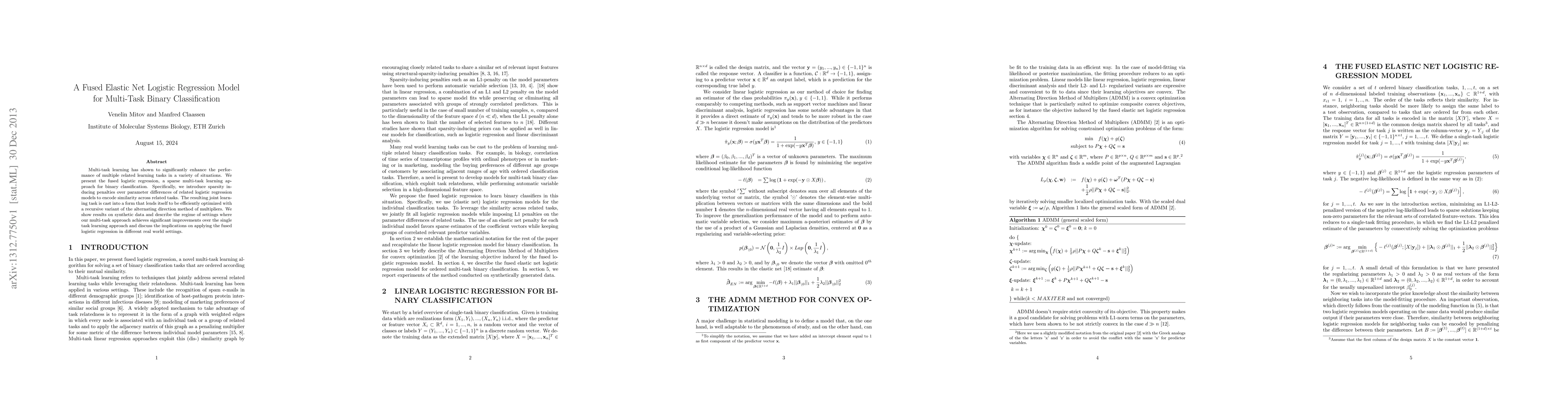 This paper proposes a fused elastic net logistic regression model for multi-task binary classification, utilizing sparsity-inducing penalties to encode task similarities. The model is efficiently optimized using a recursive variant of the alternating direction method of multipliers, demonstrating significant improvements over single task learning in various settings.
