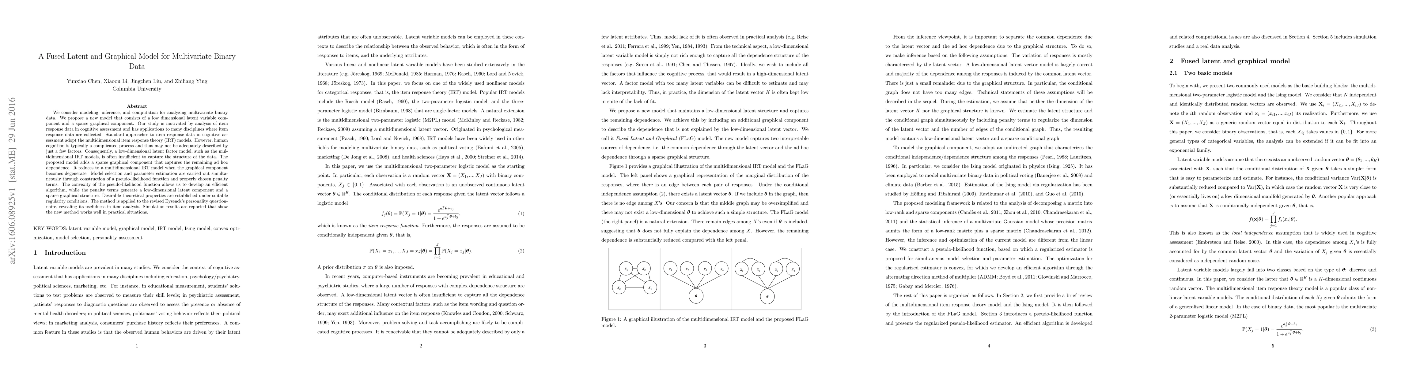 This paper proposes a fused latent and graphical model for analyzing multivariate binary data, combining a low-dimensional latent variable component with a sparse graphical component to better capture complex dependencies. The method is applied to item response data in cognitive assessments and demonstrates improved performance over standard multidimensional IRT models.