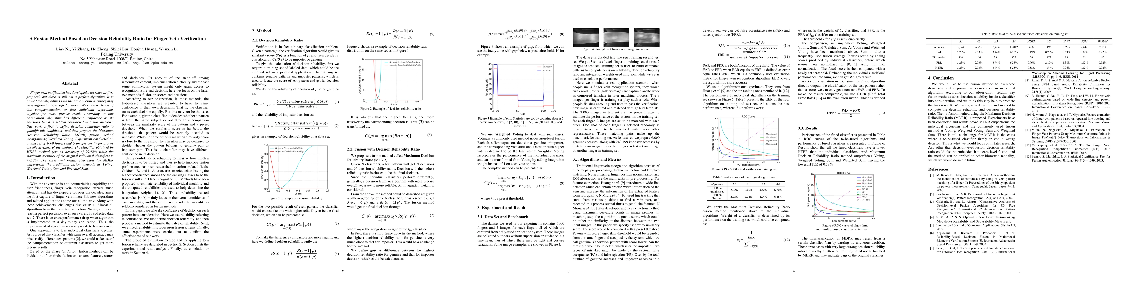 This paper proposes a fusion method based on the Decision Reliability Ratio to enhance finger vein verification accuracy. The Maximum Decision Reliability Ratio (MDRR) method, incorporating Weighted Voting, achieves 99.42% accuracy, significantly outperforming traditional fusion methods and the best individual classifier's 97.77% accuracy.