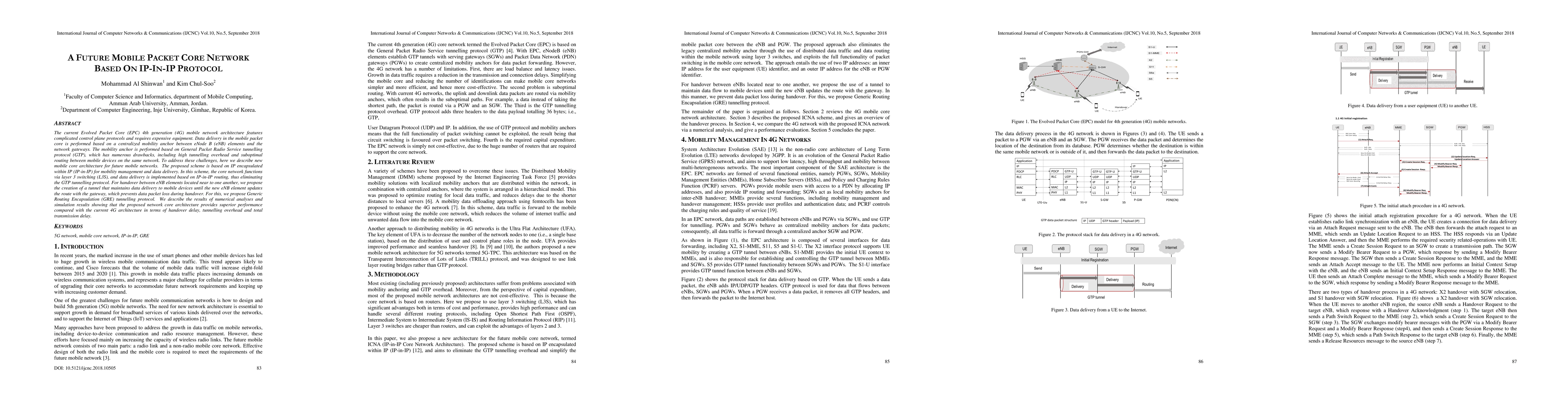 The paper presents a novel mobile packet core architecture based on IP-in-IP protocols for mobility management and data delivery, eliminating GTP and centralized mobility anchor, and utilizing layer 3 switching for improved performance.