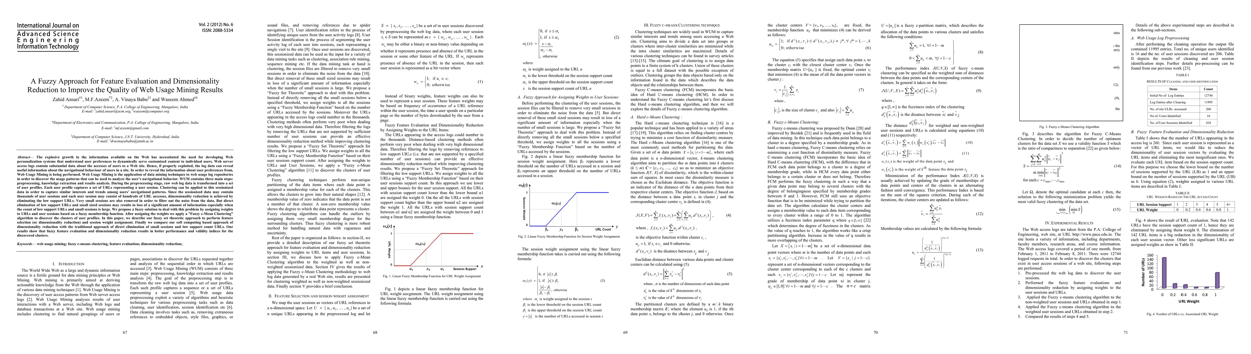 This paper proposes a fuzzy approach for feature evaluation and dimensionality reduction in web usage mining to improve the quality of discovered user profiles. It uses fuzzy membership functions to weight URLs and sessions, applying a Fuzzy c-Mean Clustering algorithm to identify user clusters, thereby achieving better performance and validity compared to traditional direct elimination methods.