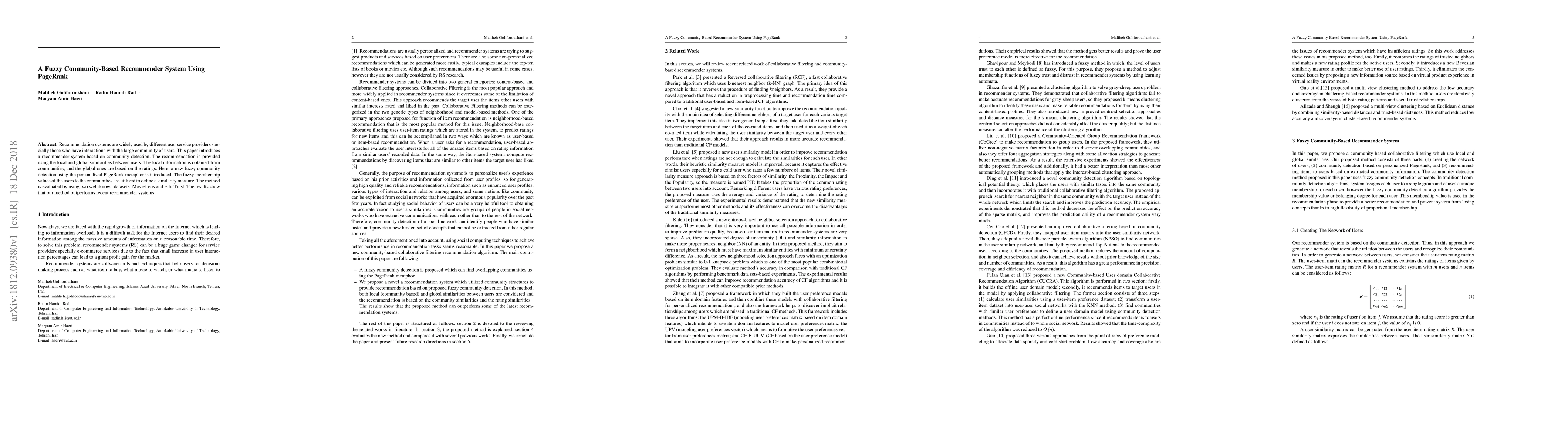 This paper proposes a community-based recommender system utilizing fuzzy membership and personalized PageRank for community detection. It outperforms recent methods on MovieLens and FilmTrust datasets by leveraging local and global user similarities.
