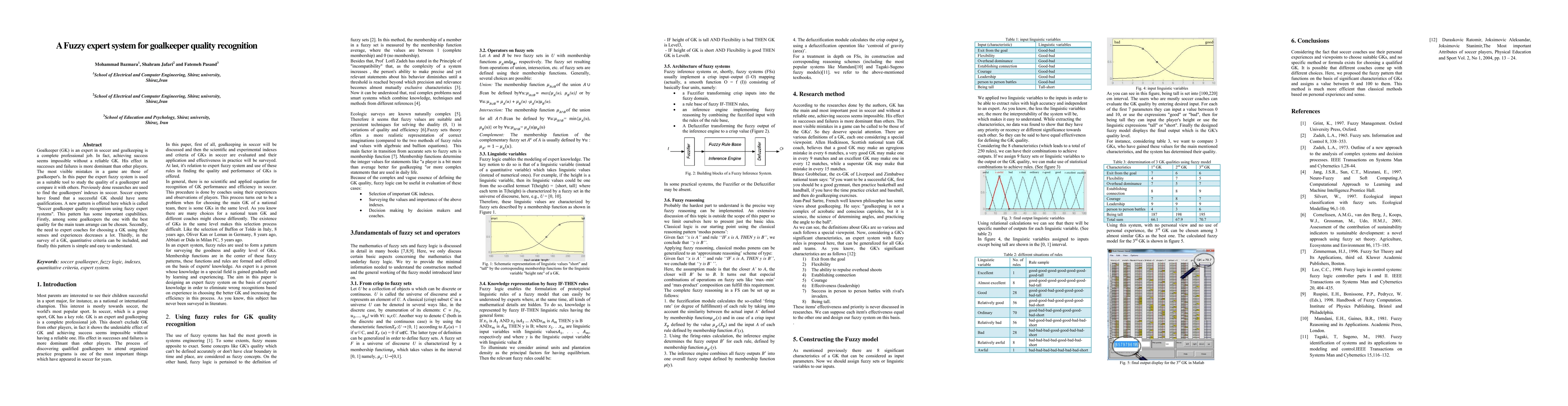 This paper proposes a fuzzy expert system to evaluate and compare the quality of soccer goalkeepers based on established criteria. The system aims to automate the selection process, reducing reliance on expert coaches' subjective judgments and incorporating quantitative measures.