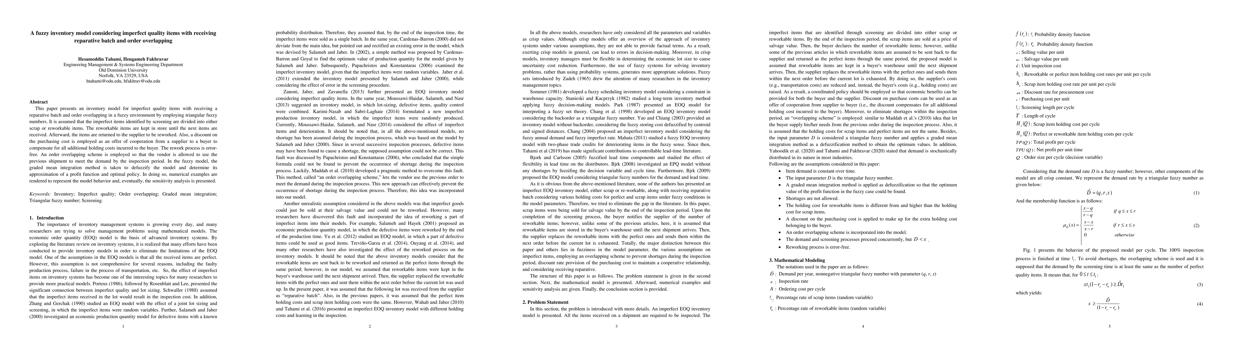 This paper proposes an inventory model for imperfect quality items with receiving reparative batches and overlapping orders in a fuzzy environment, using triangular fuzzy numbers to minimize holding costs. The model employs a discount offer from the supplier to compensate buyers for additional holding costs.