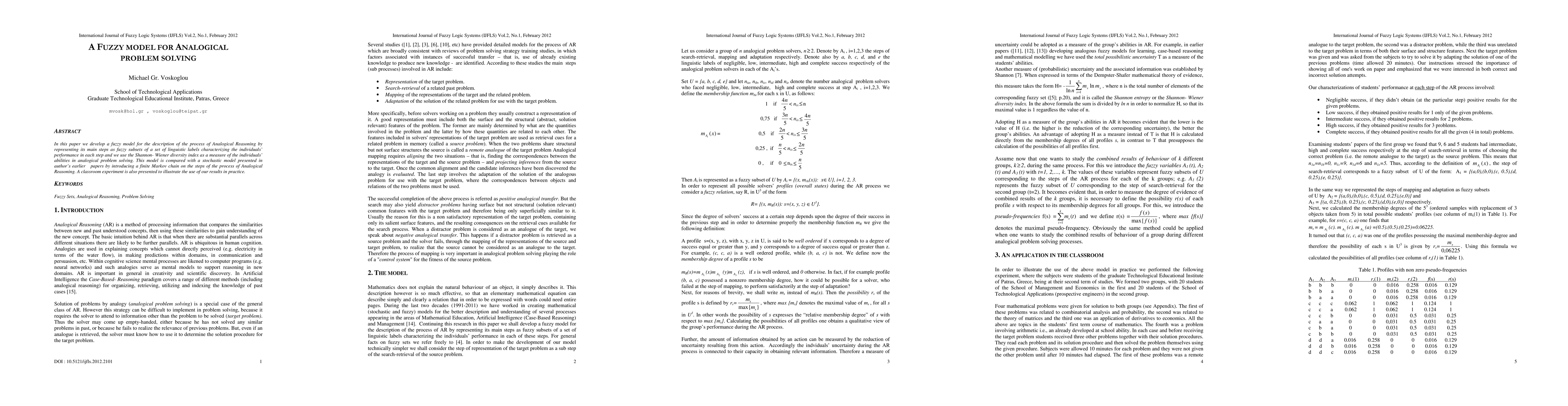 Researchers developed a fuzzy model for analogical problem solving, using Shannon-Wiener diversity index to measure individual abilities, and compared it with a stochastic model in a classroom experiment.