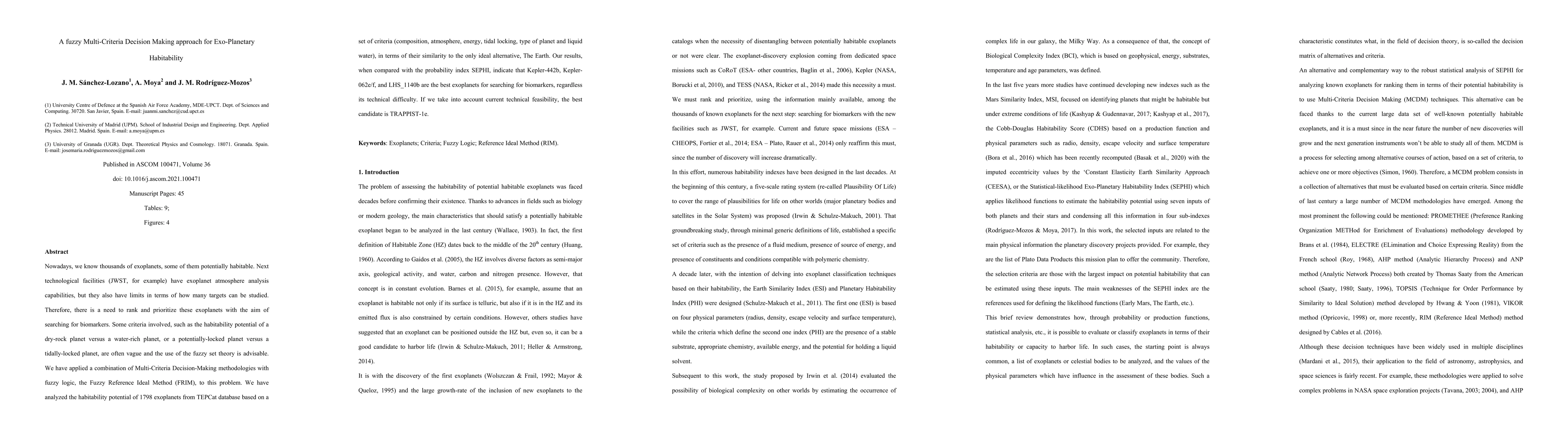 This paper uses a fuzzy Multi-Criteria Decision Making approach to rank 1798 exoplanets for habitability based on criteria like composition and atmosphere. The Fuzzy Reference Ideal Method (FRIM) identified Kepler-442b, Kepler-062e/f, and LHS_1140b as the best candidates for biomarker search, while TRAPPIST-1e emerged as the most technically feasible option.