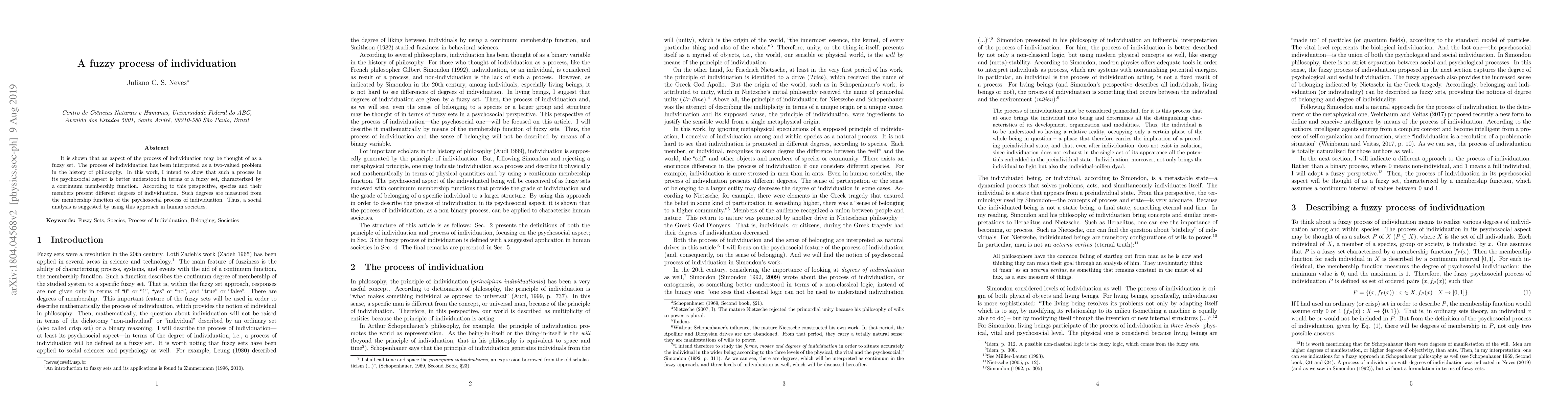 This paper proposes viewing individuation, the process of becoming a distinct individual, as a fuzzy set rather than a two-valued problem. It suggests using a continuum membership function to measure degrees of individuation in species and social analysis.