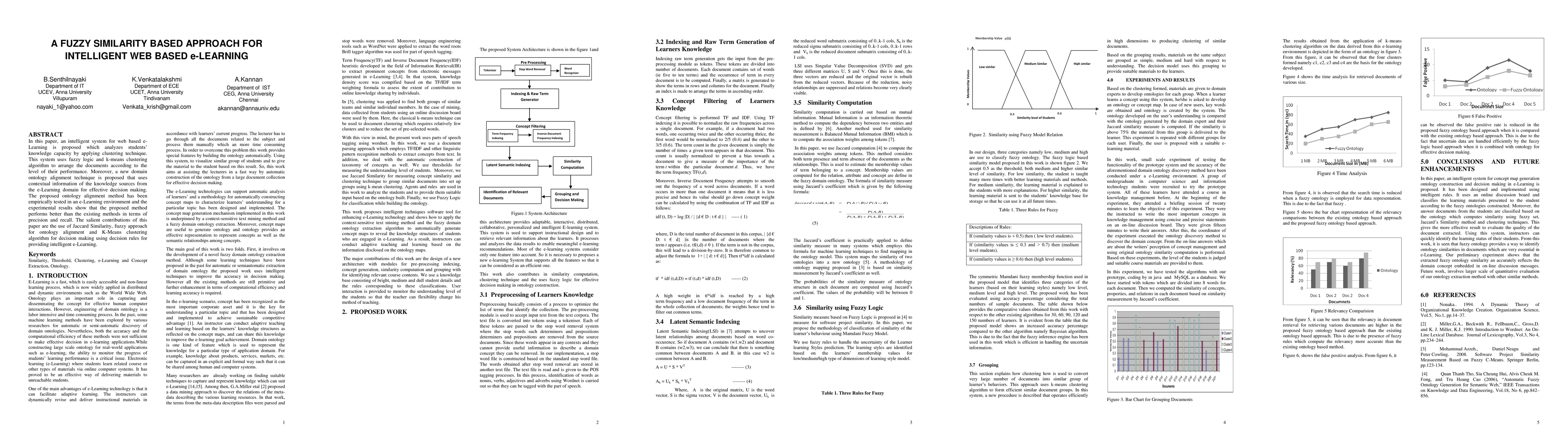 In this paper, an intelligent system for web based e-Learning is proposed which analyzes students knowledge capacity by applying clustering technique. This system uses fuzzy logic and k-means clustering algorithm to arrange the documents according to the level of their performance. Moreover, a new domain ontology alignment technique is proposed that uses contextual information of the knowledge sources from the e-Learning domain for effective decision making. The proposed ontology alignment method has been empirically tested in an e-Learning environment and the experimental results show that the proposed method performs better than the existing methods in terms of precision and recall. The salient contributions of this paper are the use of Jaccard Similarity, fuzzy approach for ontology alignment and K-Means clustering algorithm for decision making using decision rules for providing intelligent e-Learning.