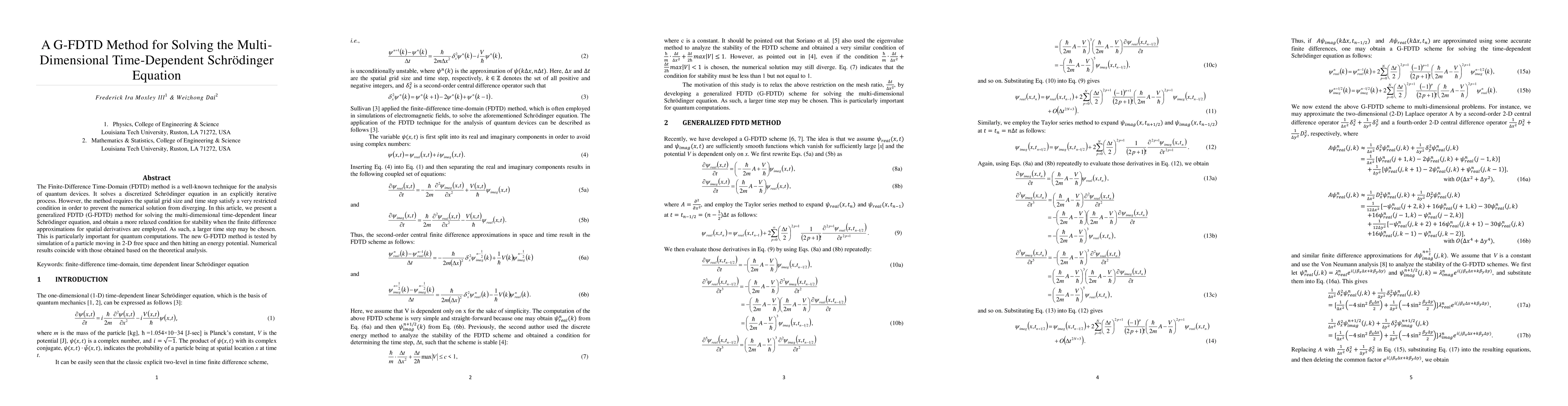 The Finite-Difference Time-Domain (FDTD) method is a well-known technique for the analysis of quantum devices. It solves a discretized Schrodinger equation in an explicitly iterative process. However, the method requires the spatial grid size and time step satisfy a very restricted condition in order to prevent the numerical solution from diverging. In this article, we present a generalized FDTD (G-FDTD) method for solving the multi-dimensional time-dependent Schrodinger equation, and obtain a more relaxed condition for stability when the finite difference approximations for spatial derivatives are employed. As such, a larger time step may be chosen. This is particularly important for quantum computations. The new G-FDTD method is tested by simulation of a particle moving in 2-D free space and then hitting an energy potential. Numerical results coincide with those obtained based on the theoretical analysis.