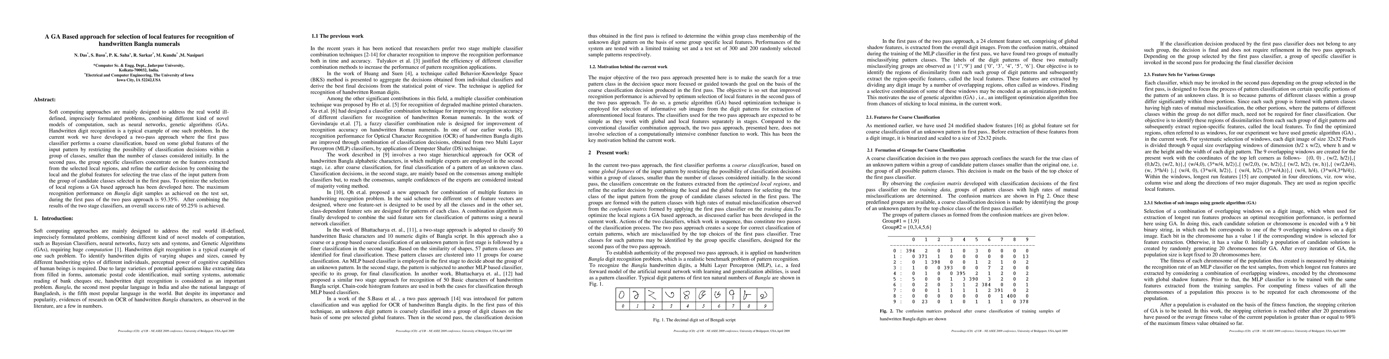 Soft computing approaches are mainly designed to address the real world ill-defined, imprecisely formulated problems, combining different kind of novel models of computation, such as neural networks, genetic algorithms (GAs. Handwritten digit recognition is a typical example of one such problem. In the current work we have developed a two-pass approach where the first pass classifier performs a coarse classification, based on some global features of the input pattern by restricting the possibility of classification decisions within a group of classes, smaller than the number of classes considered initially. In the second pass, the group specific classifiers concentrate on the features extracted from the selected local regions, and refine the earlier decision by combining the local and the global features for selecting the true class of the input pattern from the group of candidate classes selected in the first pass. To optimize the selection of local regions a GA based approach has been developed here. The maximum recognition performance on Bangla digit samples as achieved on the test set, during the first pass of the two pass approach is 93.35%. After combining the results of the two stage classifiers, an overall success rate of 95.25% is achieved.