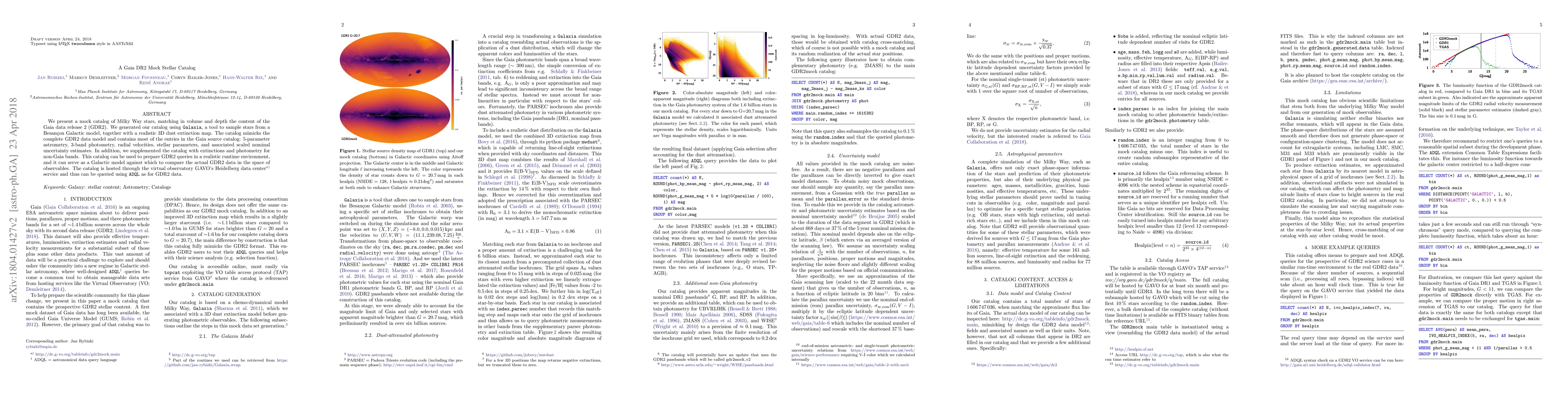 We present a mock catalog of Milky Way stars, matching in volume and depth the content of the Gaia data release 2 (GDR2). We generated our catalog using Galaxia, a tool to sample stars from a Besancon Galactic model, together with a realistic 3D dust extinction map. The catalog mimicks the complete GDR2 data model and contains most of the entries in the Gaia source catalog: 5-parameter astrometry, 3-band photometry, radial velocities, stellar parameters, and associated scaled nominal uncertainty estimates. In addition, we supplemented the catalog with extinctions and photometry for non-Gaia bands. This catalog can be used to prepare GDR2 queries in a realistic runtime environment, and it can serve as a Galactic model against which to compare the actual GDR2 data in the space of observables. The catalog is hosted through the virtual observatory GAVO's Heidelberg data center service and thus can be queried using ADQL as for GDR2 data.