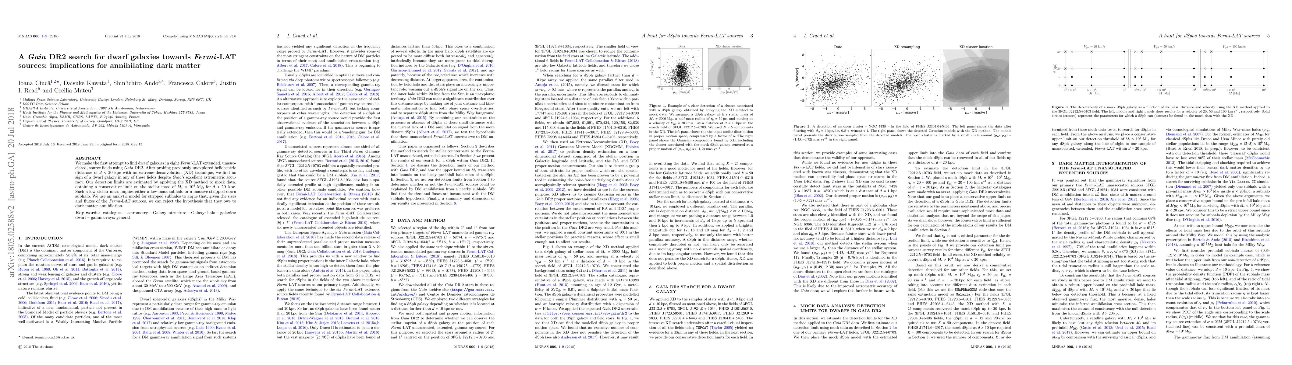 We make a first attempt to find dwarf galaxies in eight \Fermi-LAT extended, unassociated, source fields using \Gaia\ DR2. We probe previously unexplored heliocentric distances of $d<20$~kpc with an extreme-deconvolution (XD) technique. We find no signature of a dwarf galaxy in any of these fields despite \Gaia's excellent astrometric accuracy. We estimate our detection limits by applying the XD method to mock data, obtaining a conservative limit on the stellar mass of $M_* < 10^4$~M$_{\sun}$ for $d < 20$\, kpc. Such a low stellar mass implies either a low-mass subhalo, or a massive stripped-down subhalo. We use an analytic model for stripped subhalos to argue that, given the sizes and fluxes of the \Fermi-LAT sources, we can reject the hypothesis that they owe to dark matter annihilation.