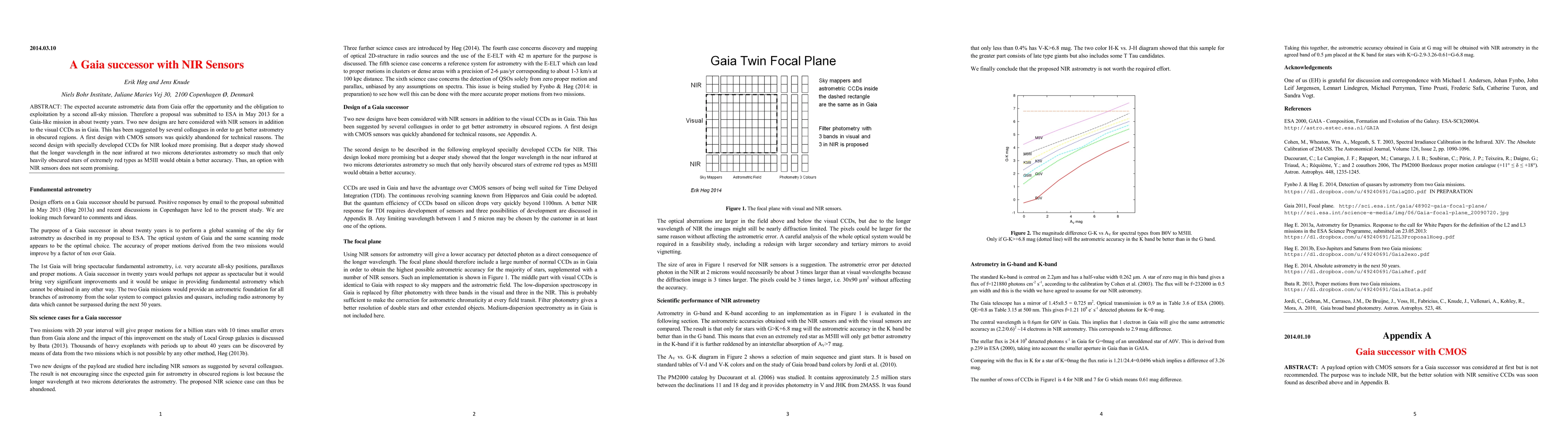 The expected accurate astrometric data from Gaia offer the opportunity and the obligation to exploitation by a second all-sky mission. Therefore a proposal was submitted to ESA in May 2013 for a Gaia-like mission in about twenty years. Two new designs are here considered with NIR sensors in addition to the visual CCDs as in Gaia. This has been suggested by several colleagues in order to get better astrometry in obscured regions. A first design with CMOS sensors was quickly abandoned for technical reasons. The second design with specially developed CCDs for NIR looked more promising. But a deeper study showed that the longer wavelength in the near infrared at two microns deteriorates astrometry so much that only heavily obscured stars of extremely red types as M5III would obtain a better accuracy. Thus, an option with NIR sensors does not seem promissing.