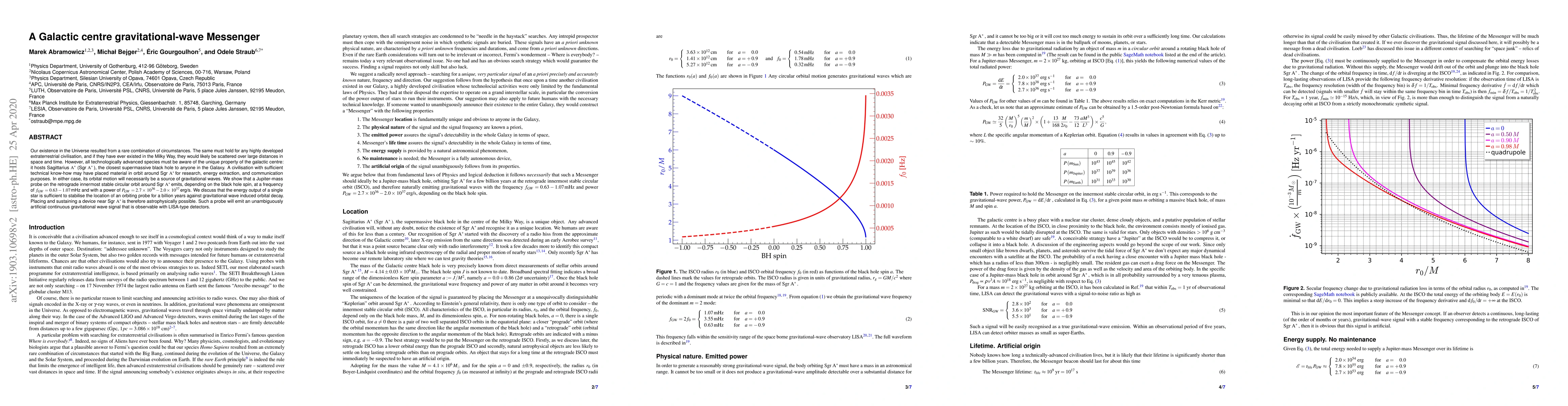 Our existence in the Universe resulted from a rare combination of circumstances. The same must hold for any highly developed extraterrestrial civilisation, and if they have ever existed in the Milky Way, they would likely be scattered over large distances in space and time. However, all technologically advanced species must be aware of the unique property of the galactic centre: it hosts Sagittarius A* (Sgr A*), the closest supermassive black hole to anyone in the Galaxy. A civilisation with sufficient technical know-how may have placed material in orbit around Sgr A* for research, energy extraction, and communication purposes. In either case, its orbital motion will necessarily be a source of gravitational waves. We show that a Jupiter-mass probe on the retrograde innermost stable circular orbit around Sgr A* emits, depending on the black hole spin, at a frequency of $f_{GW} = 0.63 - 1.07$ mHz and with a power of $P_{GW}=2.7 \times\, 10^{36} - 2.0 \times\, 10^{37}$ erg/s. We discuss that the energy output of a single star is sufficient to stabilise the location of an orbiting probe for a billion years against gravitational wave induced orbital decay. Placing and sustaining a device near Sgr A* is therefore astrophysically possible. Such a probe will emit an unambiguously artificial continuous gravitational wave signal that is observable with LISA-type detectors.